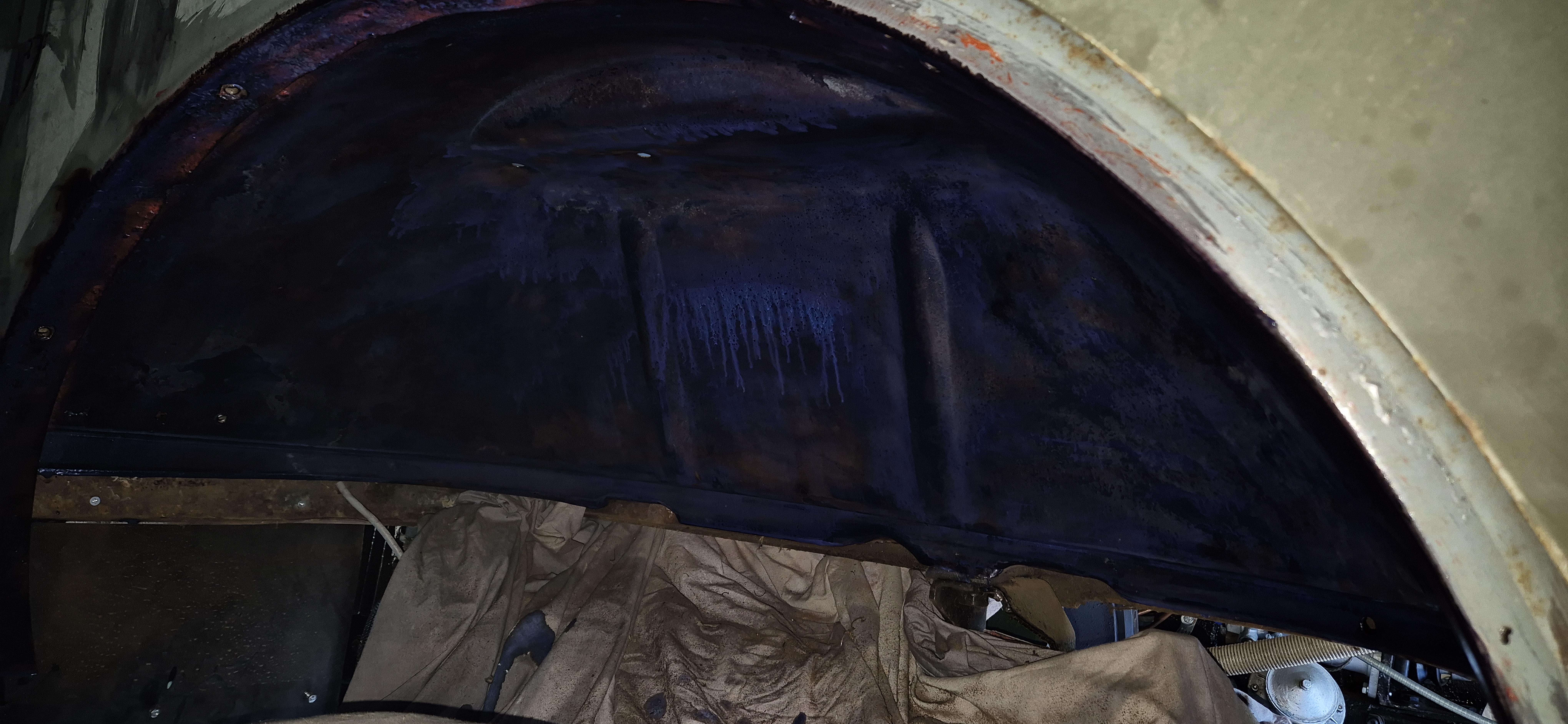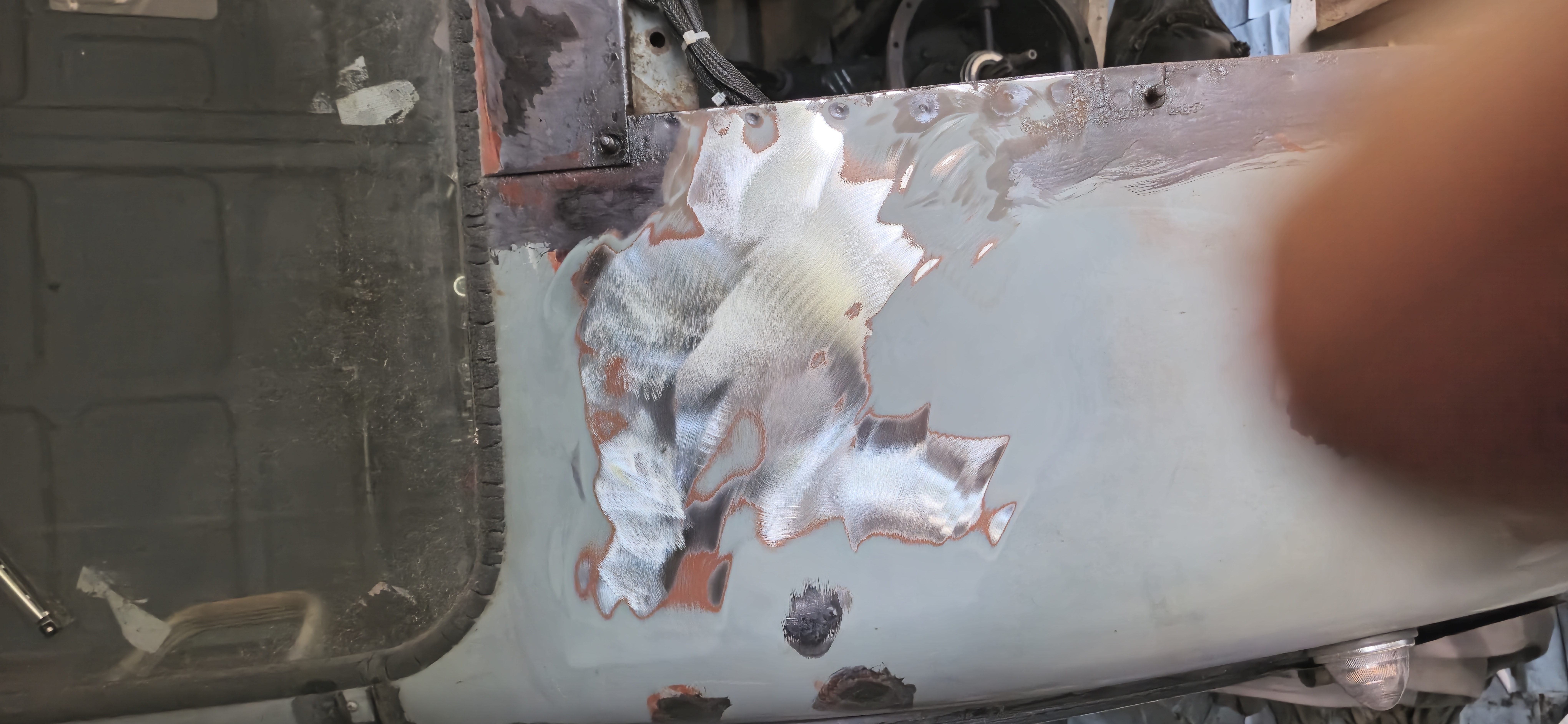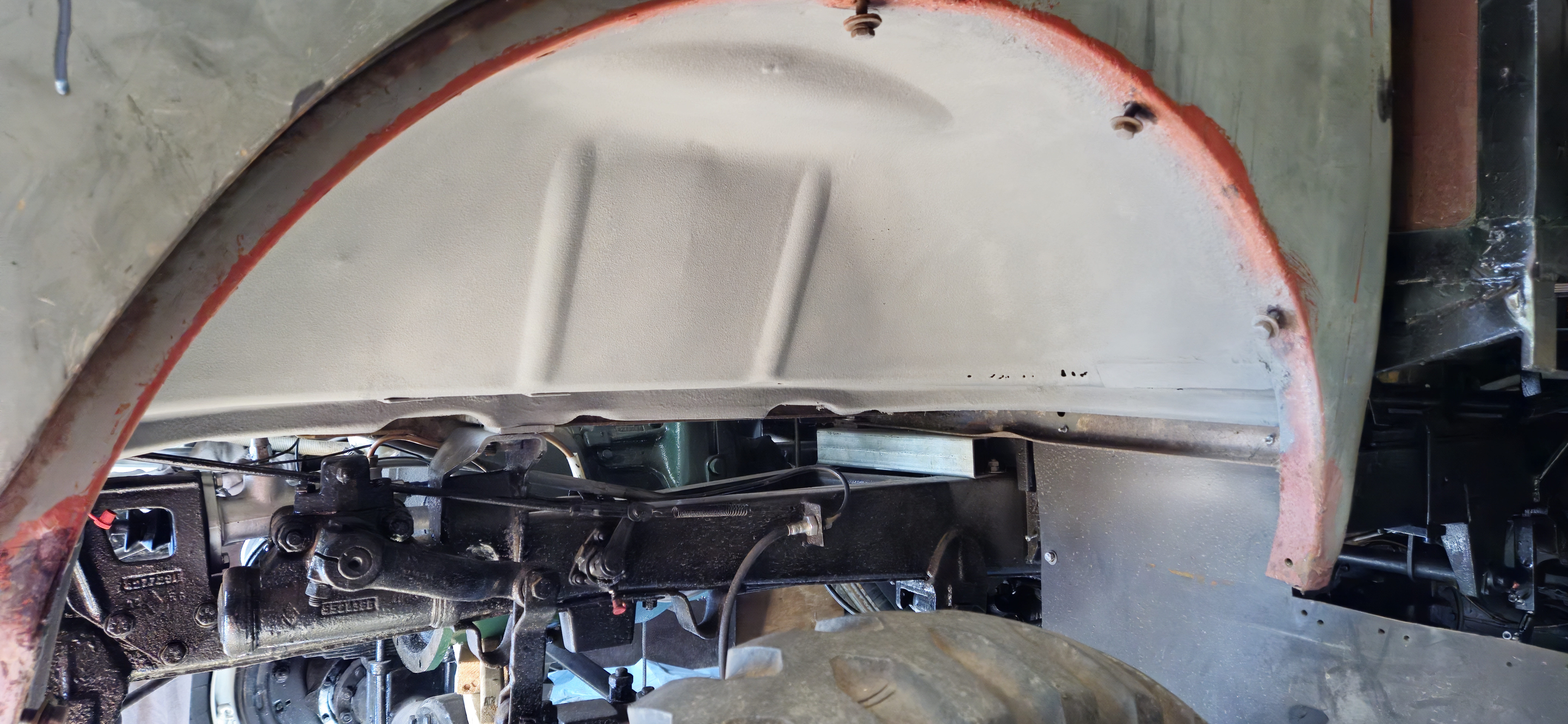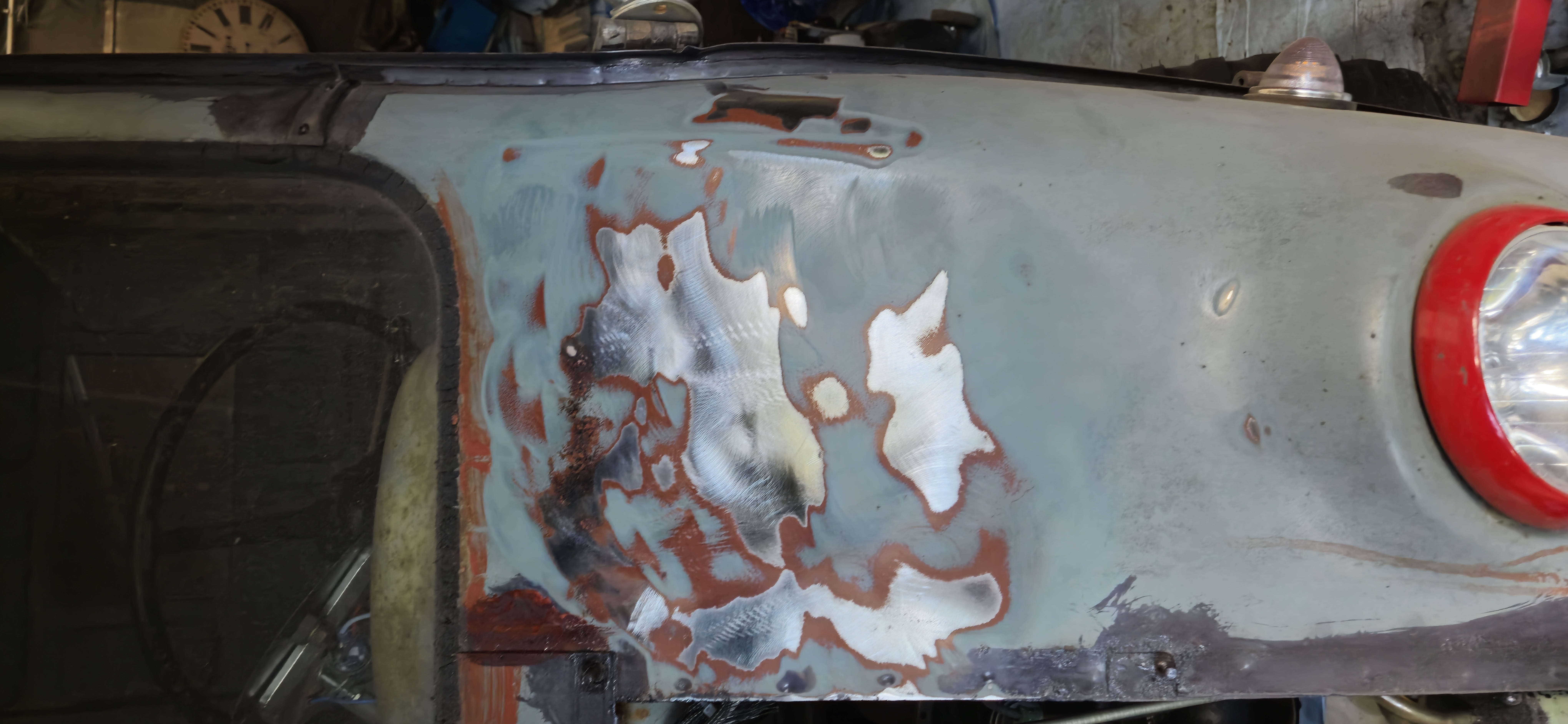 Sablage des toles du plancher, cerclage de phare , support moteur essuie glace , puis peinture à l'appret