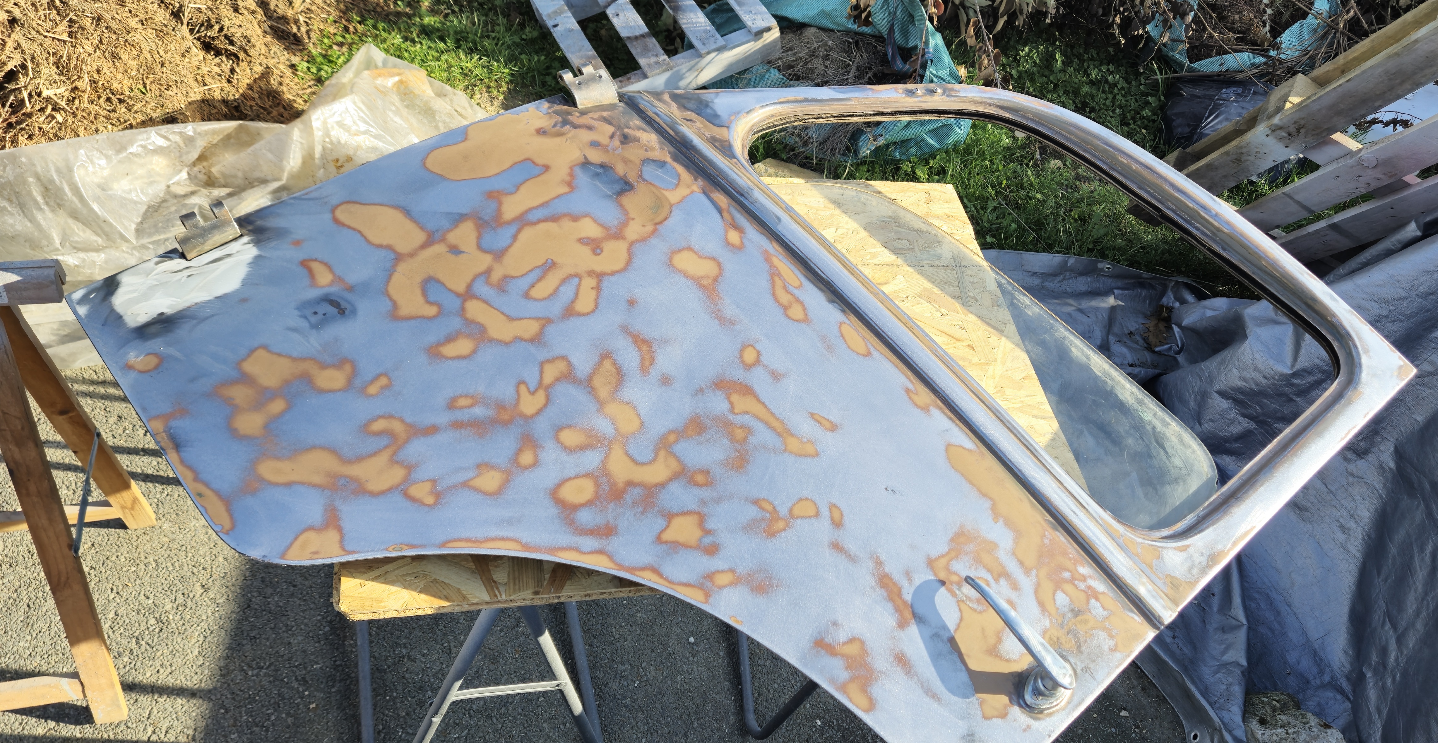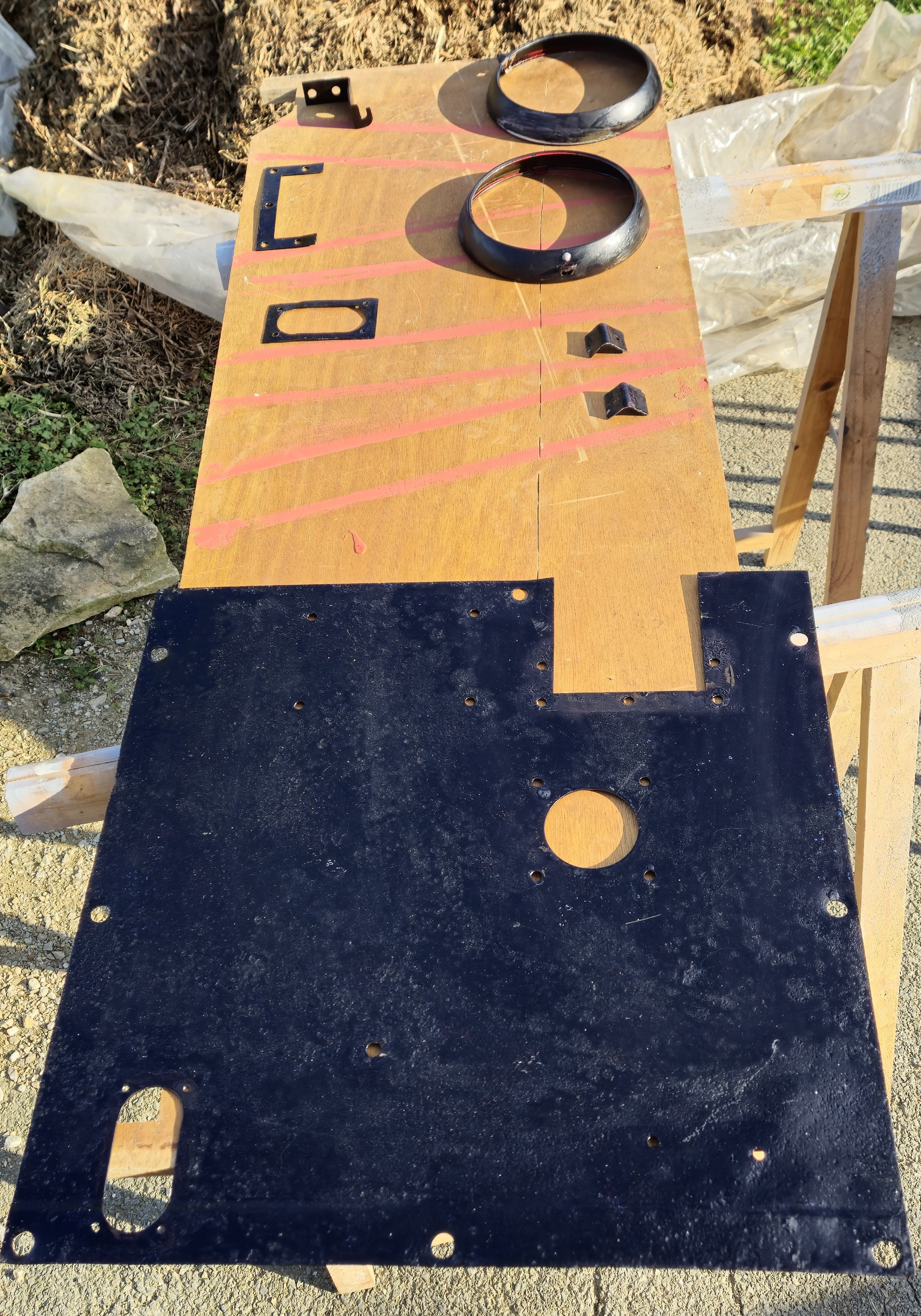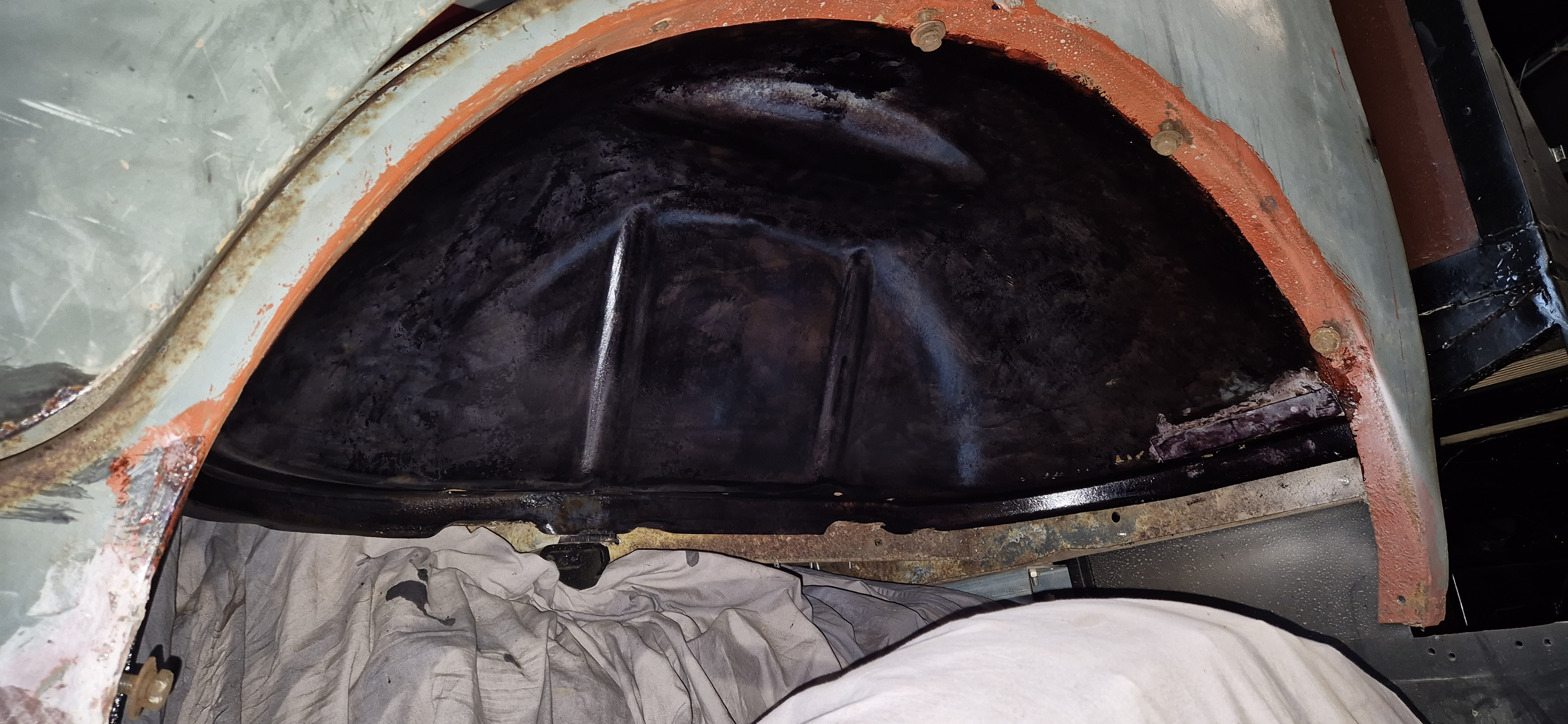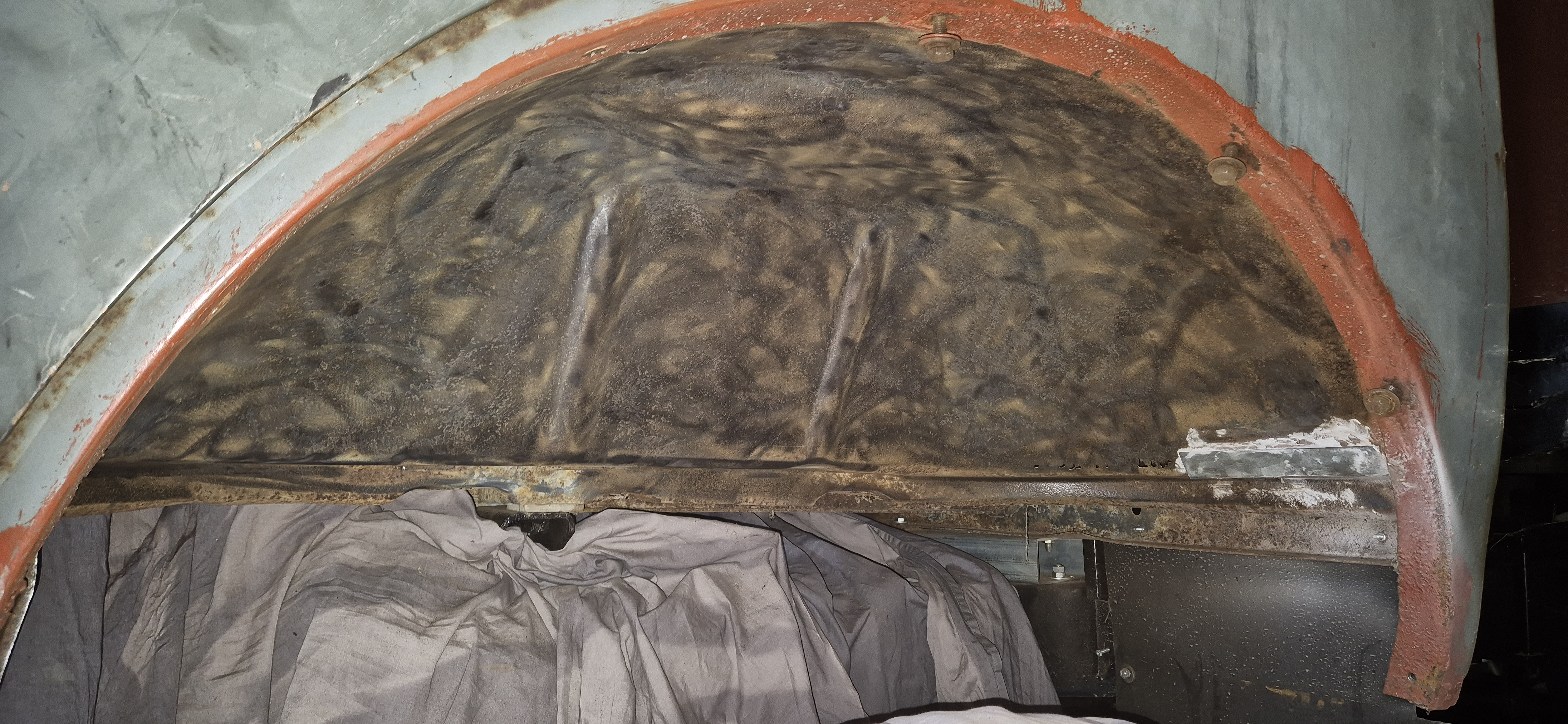 Sablage des toles du plancher, cerclage de phare , support moteur essuie glace , puis peinture à l'appret