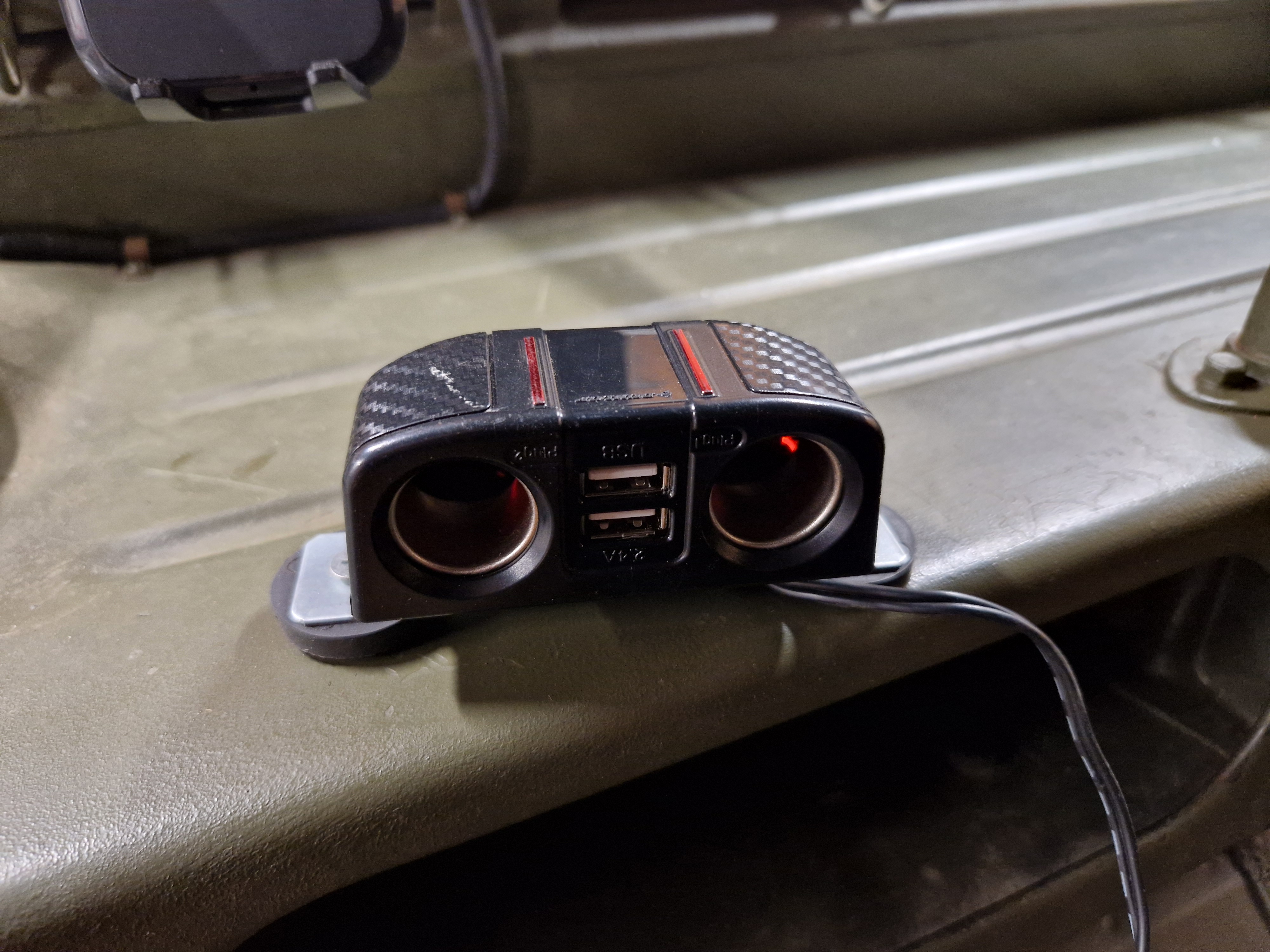 - rajout d'une prise allume-cigare dans le vide-poche central côté gauche (en retrait donc peu visible, encore plus quand j’aurais peint la platine) : je dispose en plus d’une platine mobile avec 2 prises- cigare et deux prises USB, celle-ci se branche sur l’allume-cigare et se pose où l’on veut grâce à deux plots aimantés. Cette platine est compatible 24V ce qui a simplifié les choses.