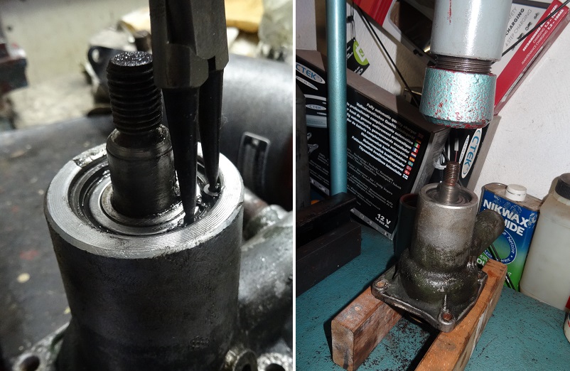 Enlever le circlips du haut et chasser l'arbre à la presse. Et c'est là qu'il s'est passé un truc pas mal. Je pompe, je pompe (comme dirait les shadocks) et l'arbre bouge bien.