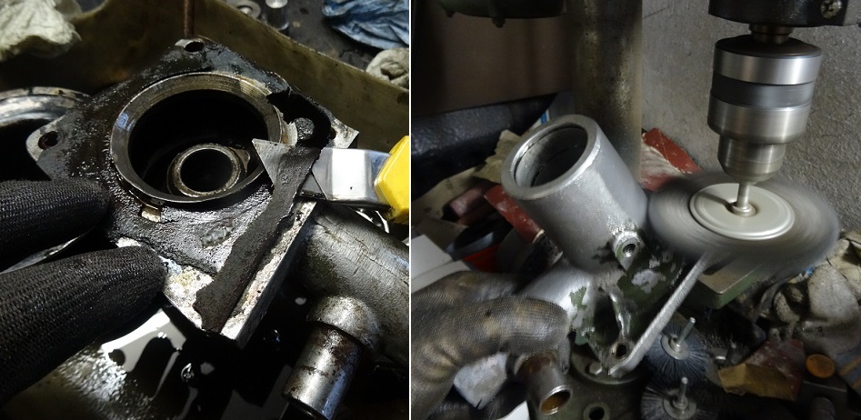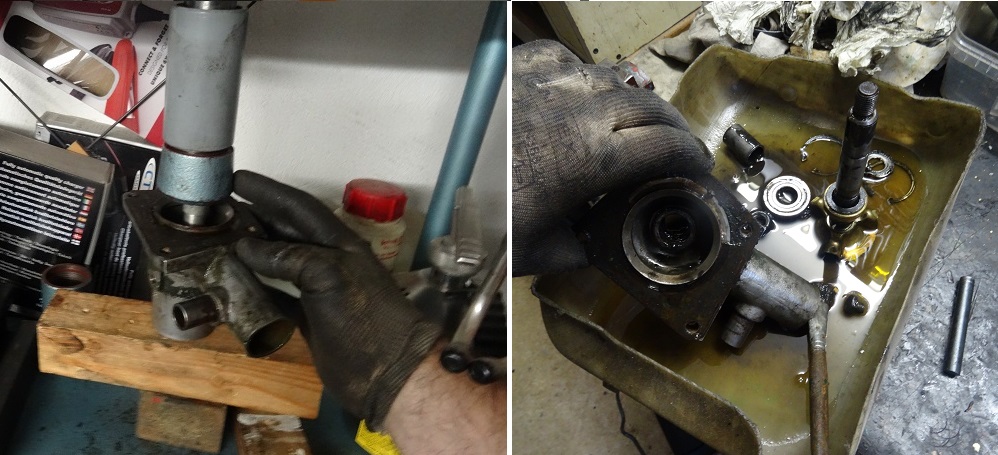 Ensuite retourner le corps, chasser le roulement coté poulie, enlever le deuxième circlips, récuperer l'entretoise et chasser le deuxième roulement à la presse. Un bon bain de benzin pour enlever les palanqués de graisse.