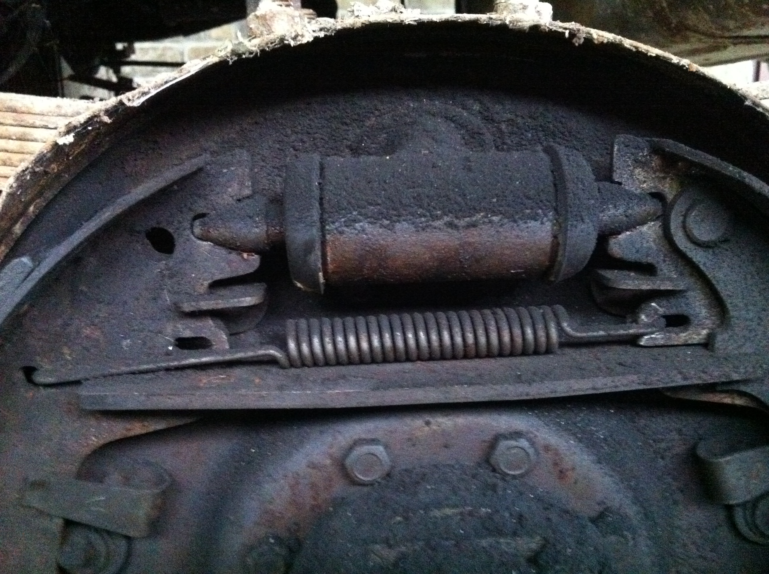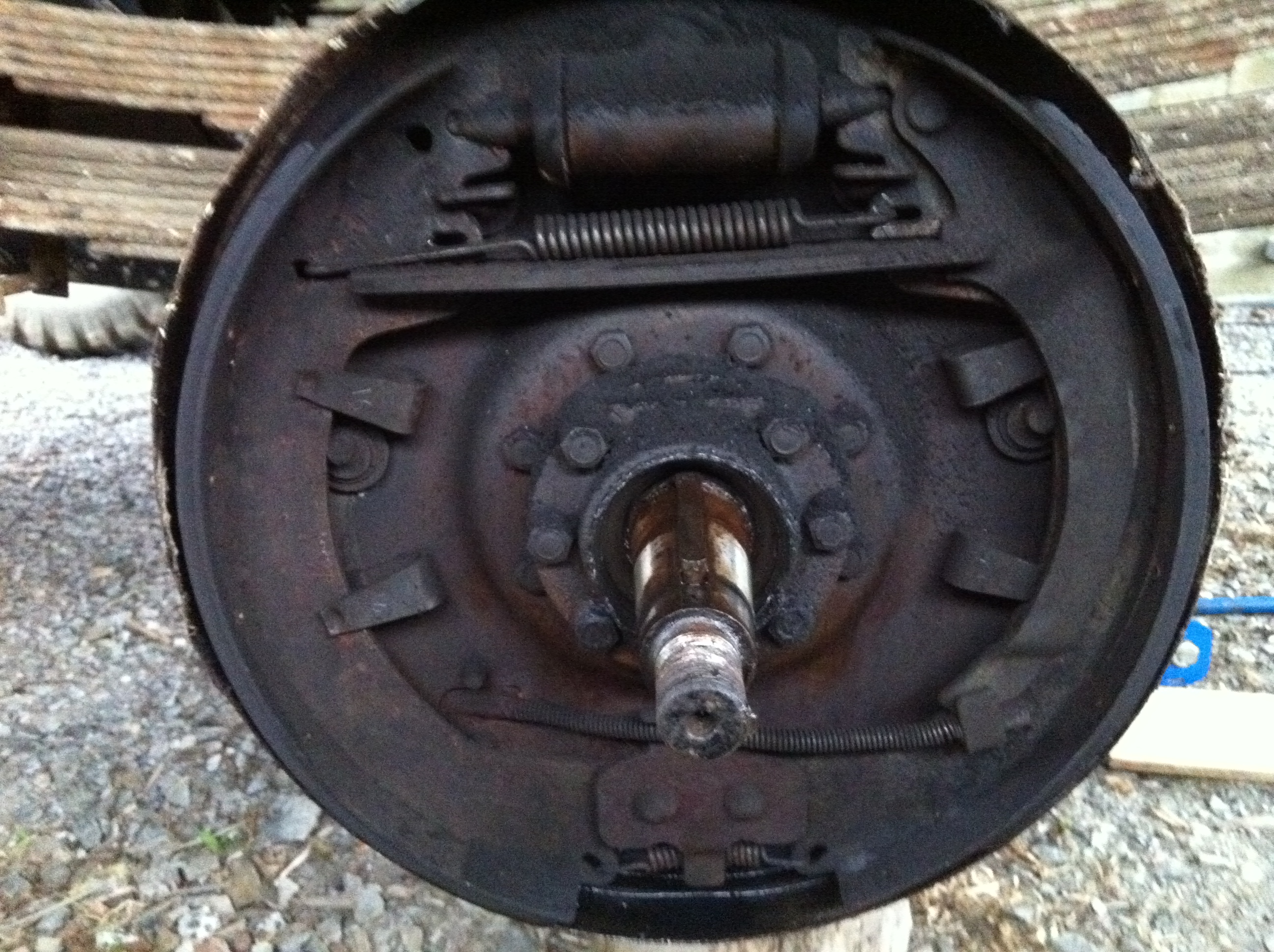 Après mise sur cales du pont arrière, je m'attaque au tambour en laissant la roue en place histoire d'avoir plus de prise pour sortir le tambour et sa roue.