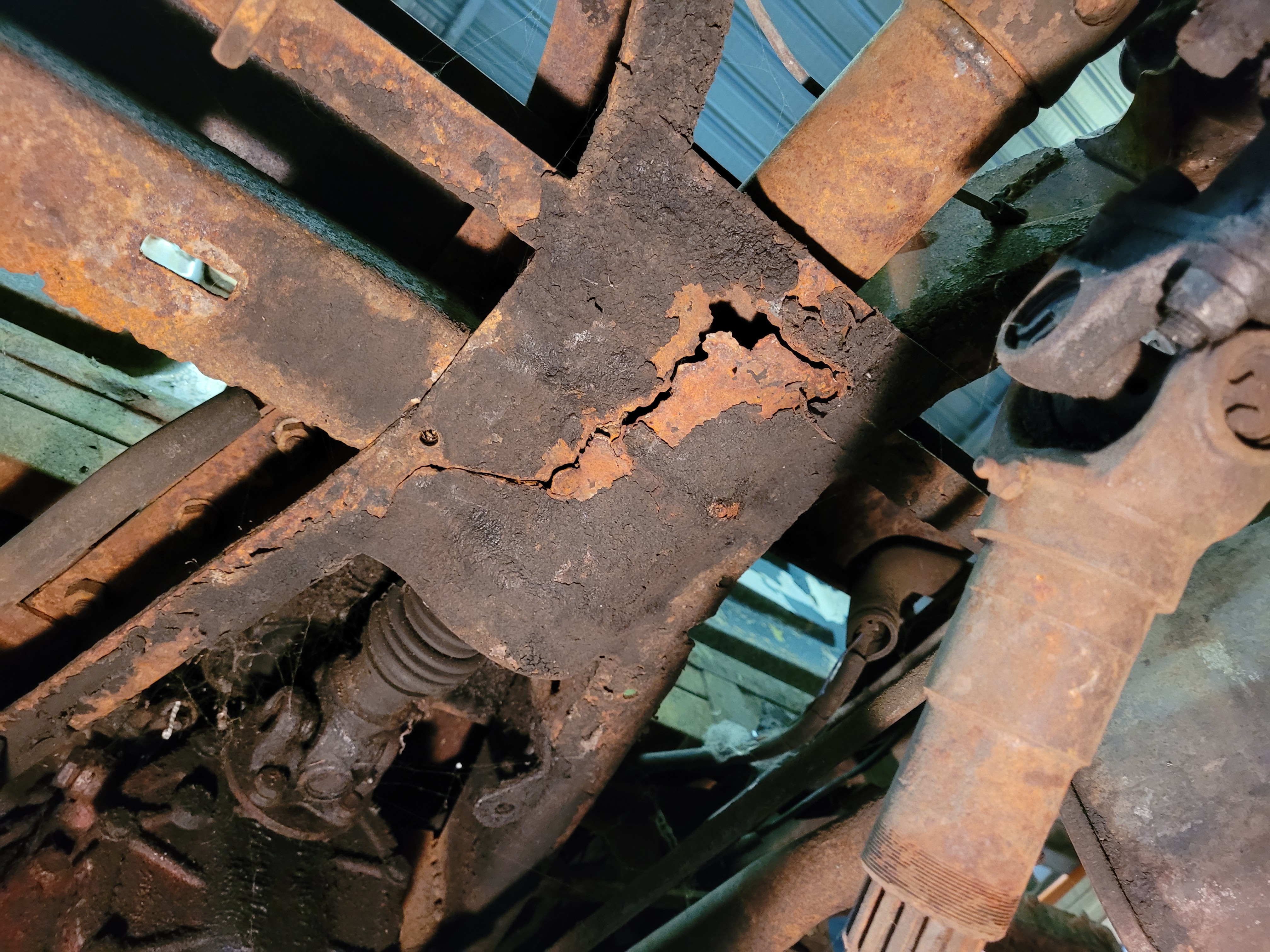 A tout ça on peu ajouté une carrosserie qui commence à être mangé par la rouille avec déjà pas mal de trou (certain on déjà été réparé il y a plusieurs années au vue de leurs état). Des supports de boite de transfert pas d'origine et soudé sur le châssis. Et j'en oublie plein, mais l'état global est vraiment pas génial.