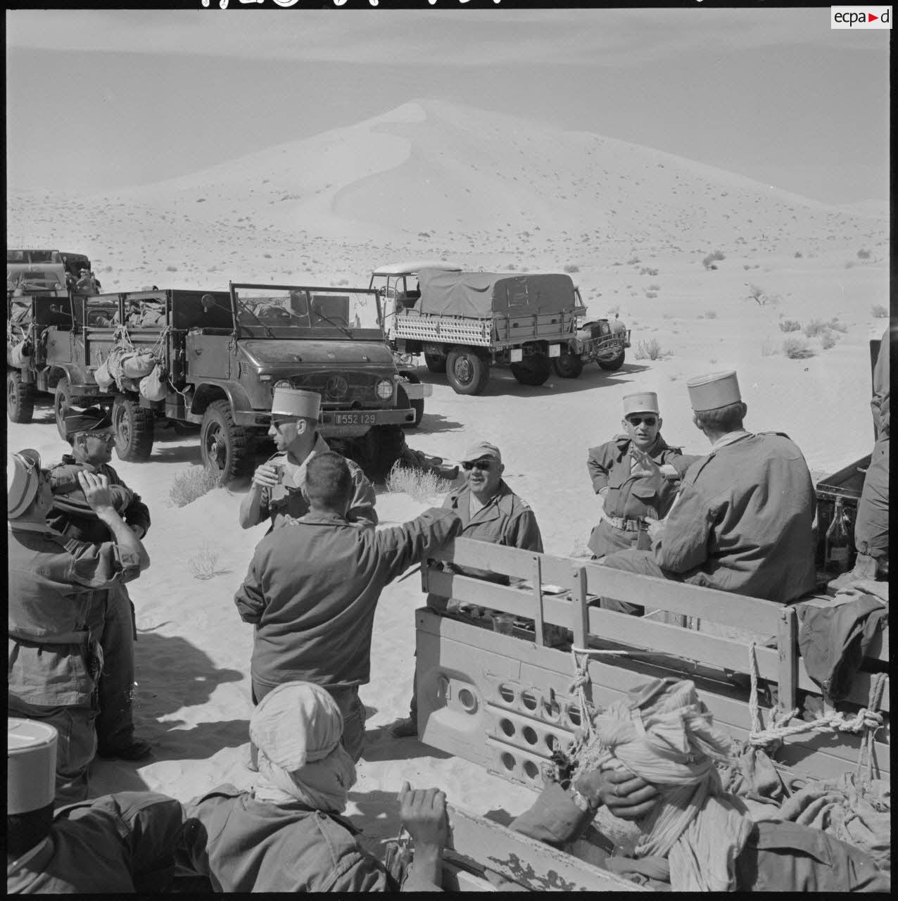 Grand Erg oriental. Arrêt casse-croûte. Véhicules Hotchkiss Willys et "Gazelle" Berliet.