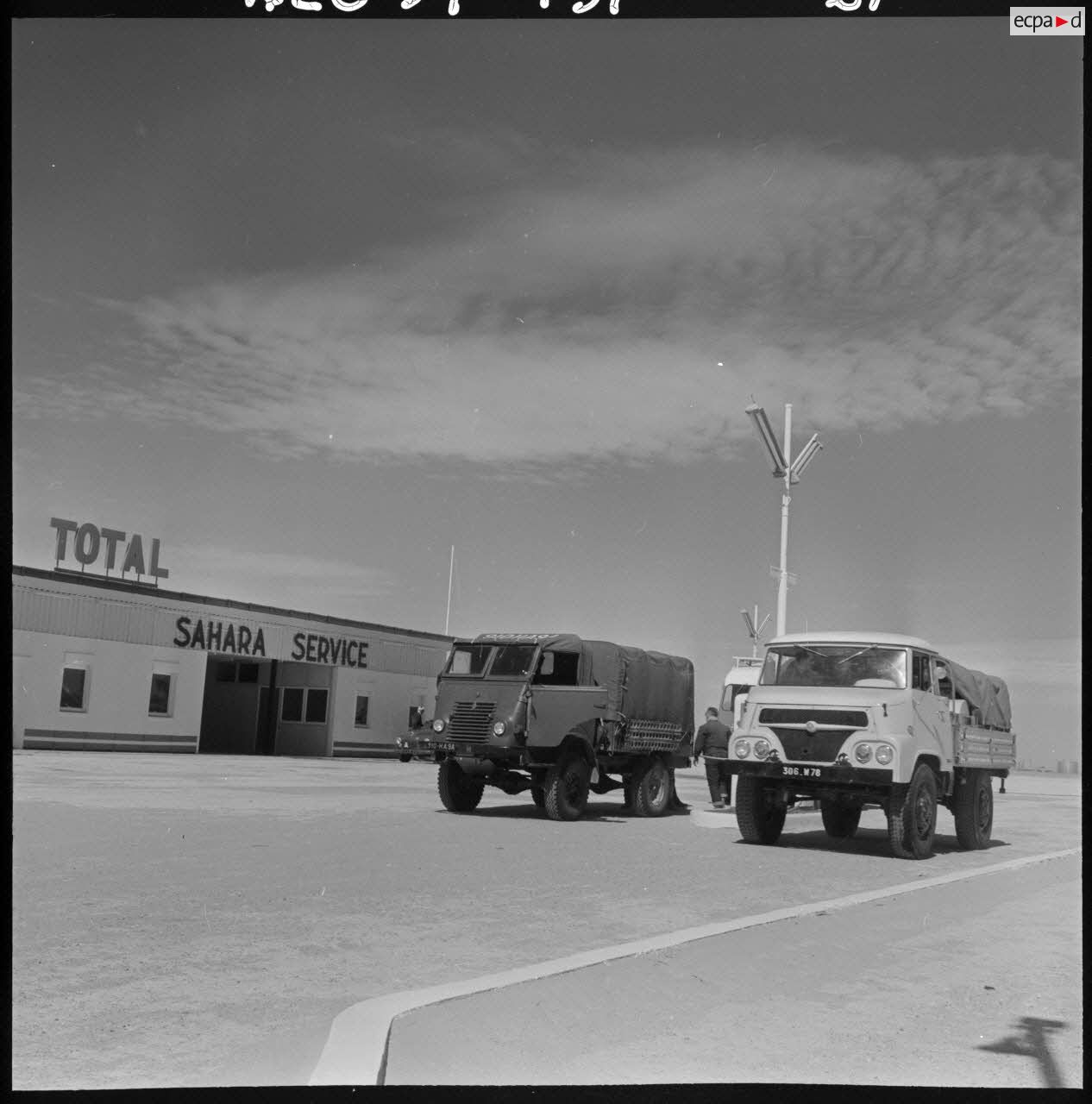 Grand Erg oriental. Les véhicules Marmon-Herrington et 4x4 Renault à la station "Sahara service".