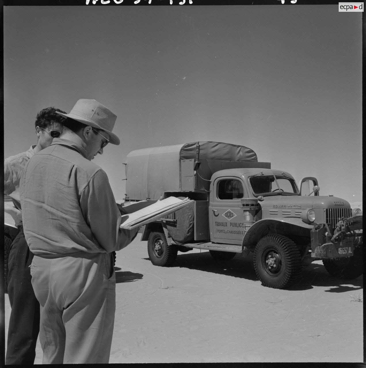 Grand Erg oriental. Equipe des travaux publics et ponts et chaussées de l'OCRS (organisation commune des régions sahariennes). Camion Power Wagon Dodge.