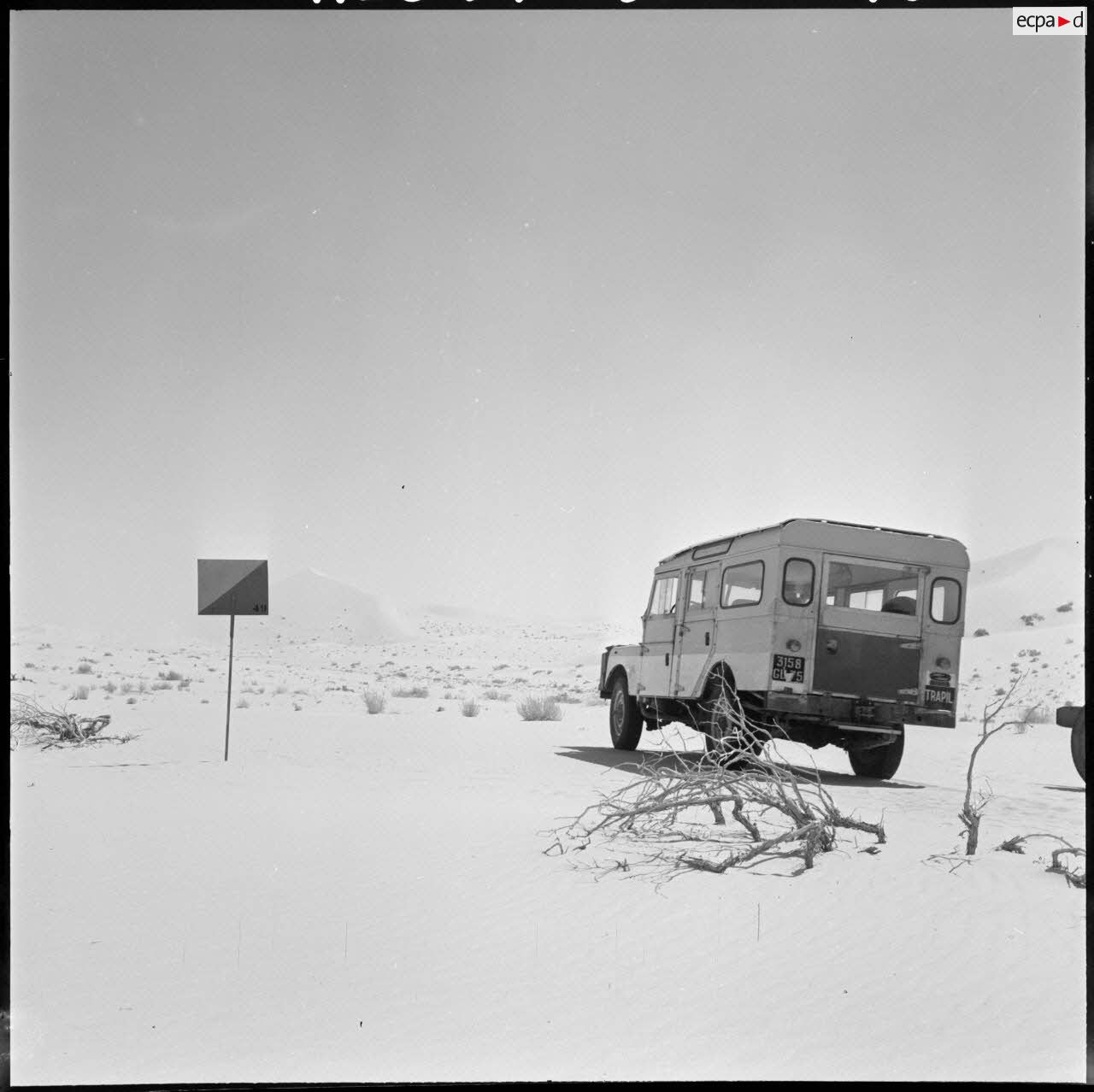 L'équipe des travaux publics de l'OCRS (organisation commune des régions sahariennes) balise la piste avec la société TRAPIL (société de transport de produits pétroliers par pipeline) et vient se rendre compte si les améliorations du parcours peuvent s'effectuer et si des matériaux nécessaires pour la construction de la piste peuvent se trouver sur place.