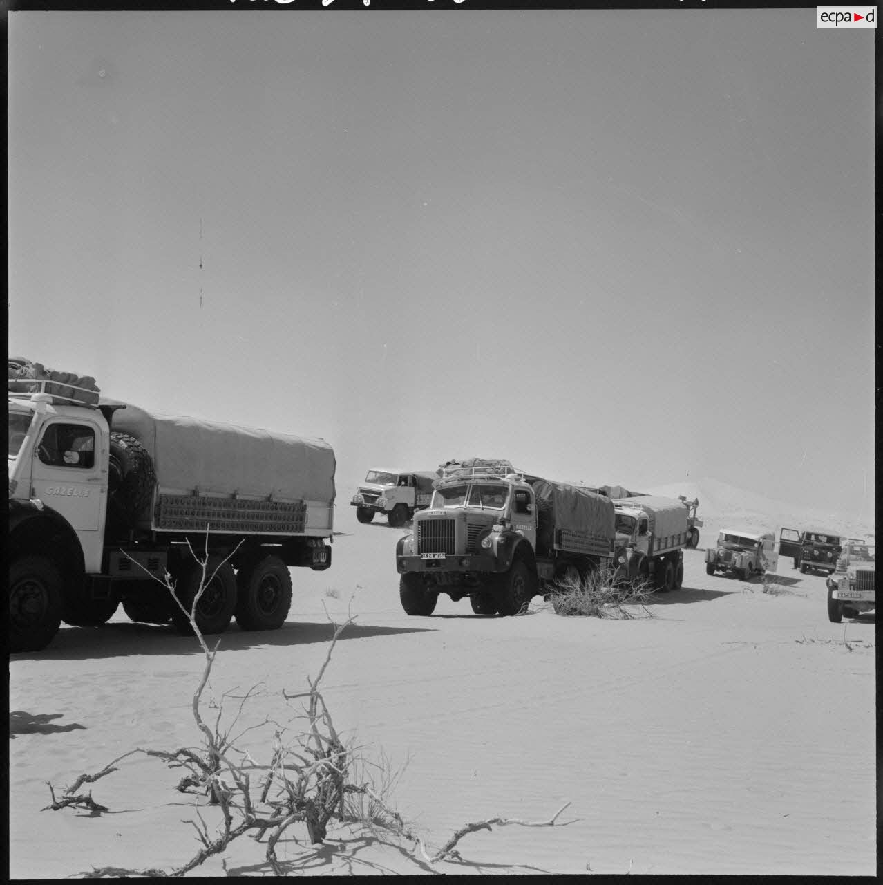 Grand Erg oriental. Le convoi roule dans la région des Grandes Dunes. En tête de la colonne, les "Gazelles" Berliet.