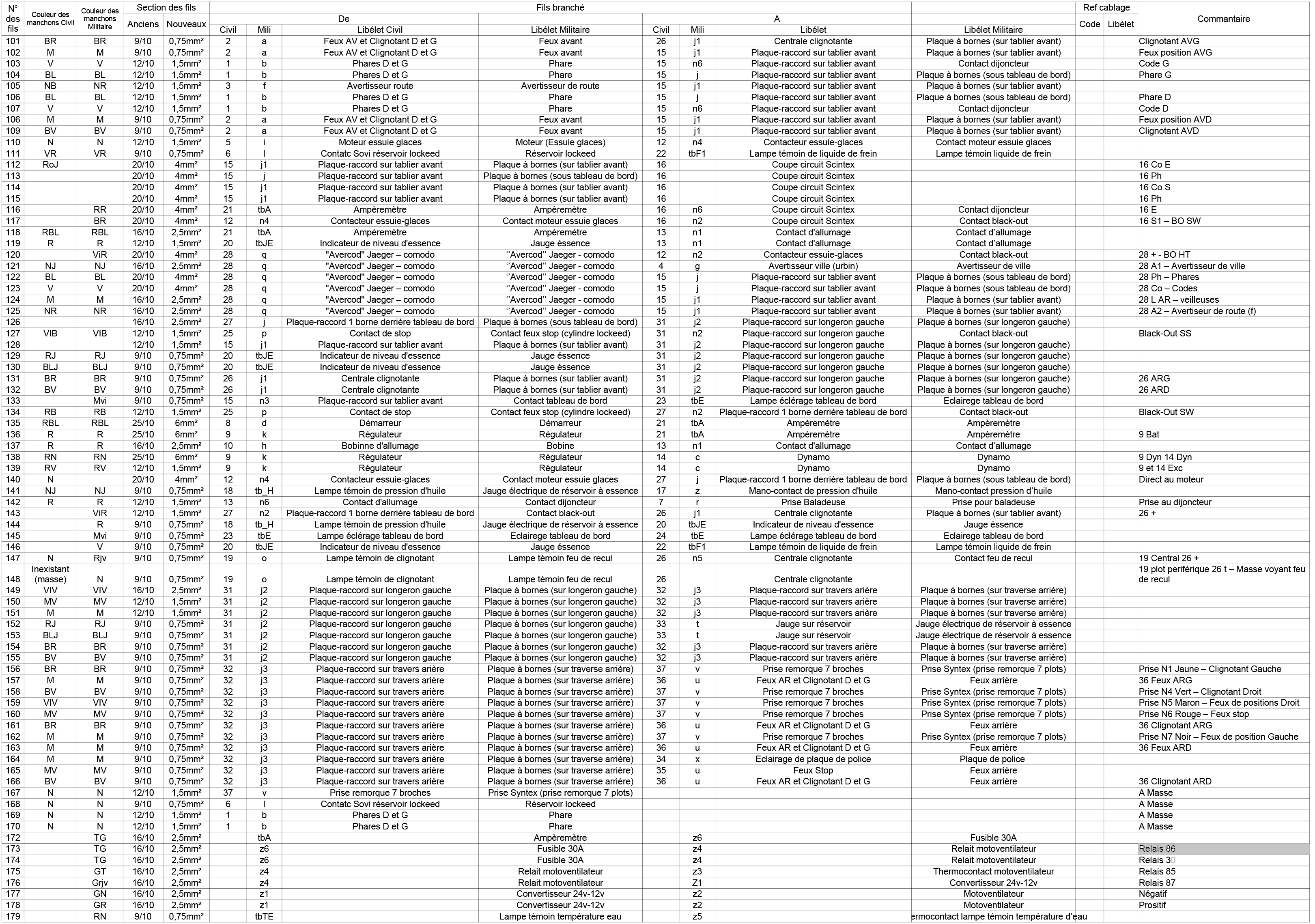 Veuillez trouver ci-joint le tableau détaillant tous le cablage. Il y a également les corespondances entre les versions civil et militaire.