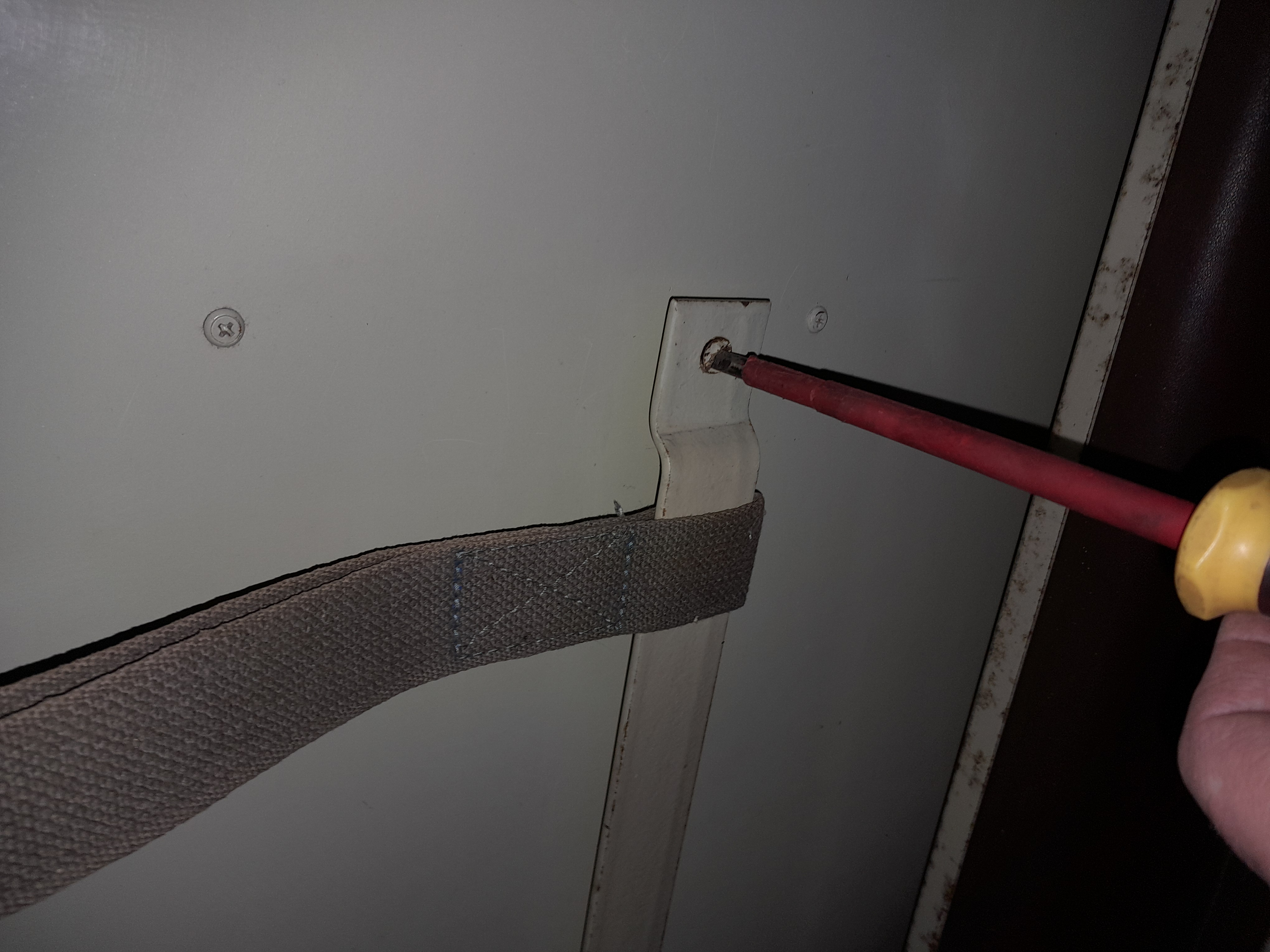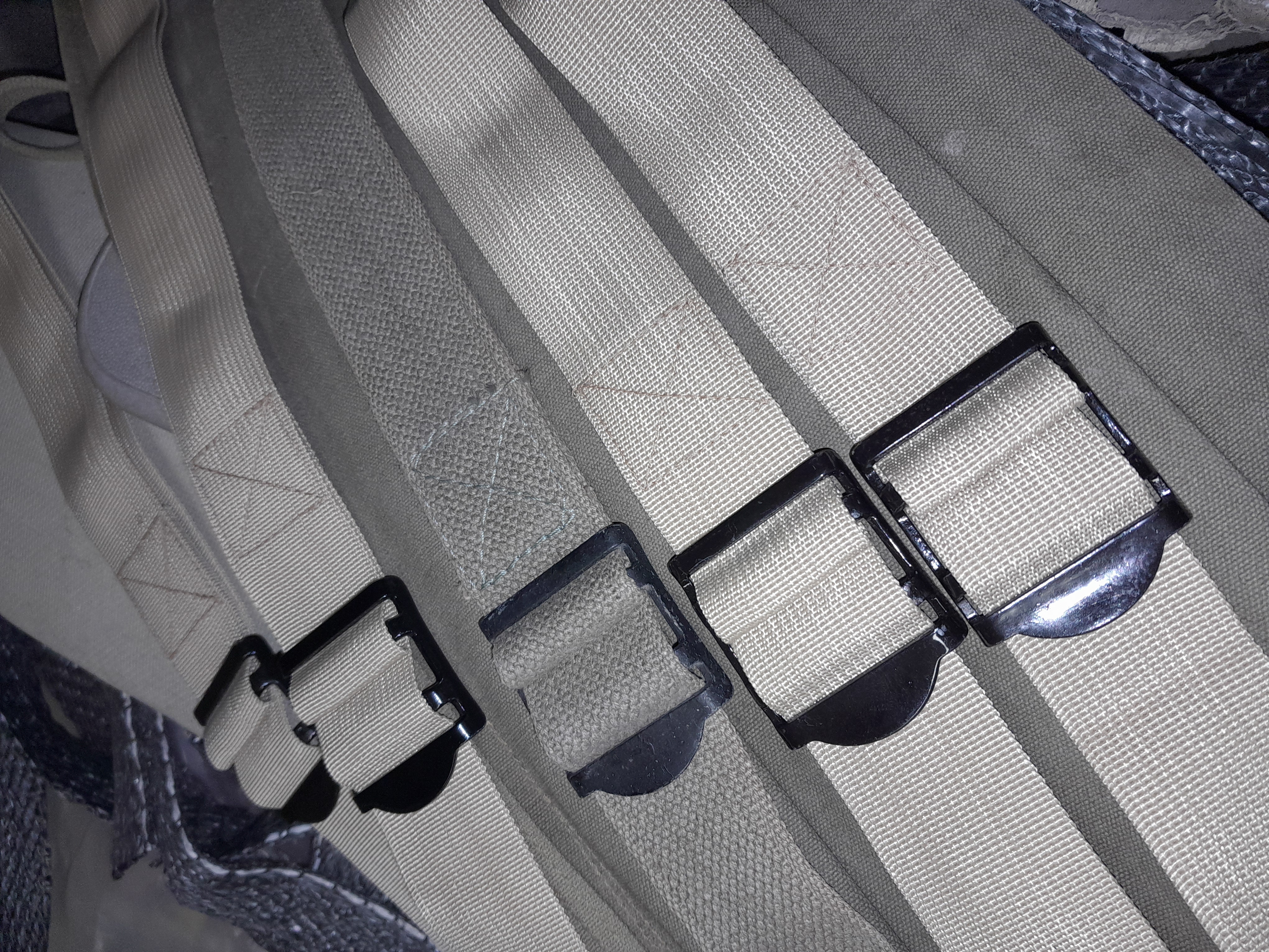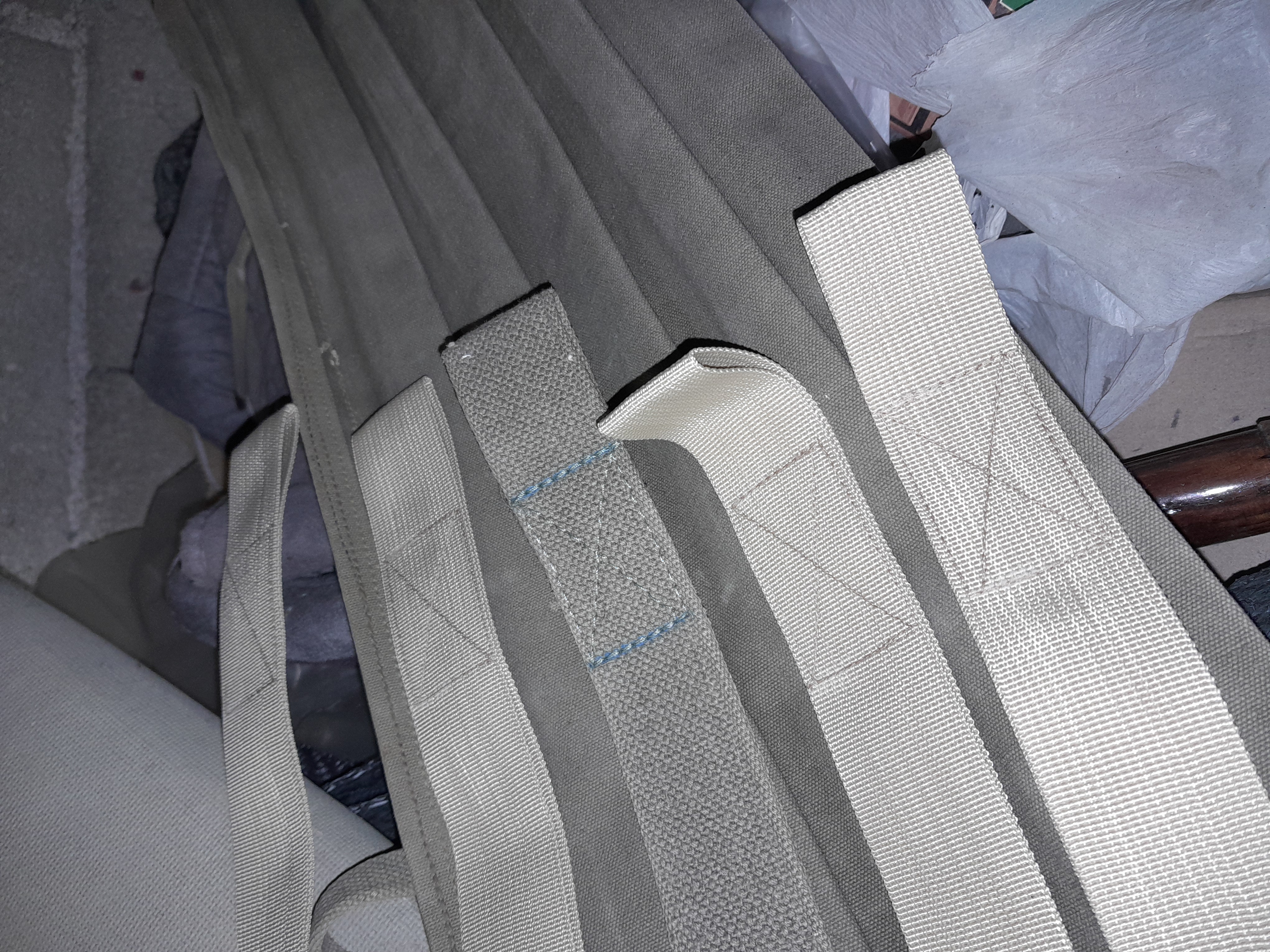 Lors de la partie 1 nous avons refait les sangles des brancards, à l'aide de sangles en nylon tressées de même largeur (4CM). Passons maintenant aux sangles latérales, au nombre de quatre, fixées sur des supports métalliques de chaque côté des panneaux droits et gauches des sanitaires.