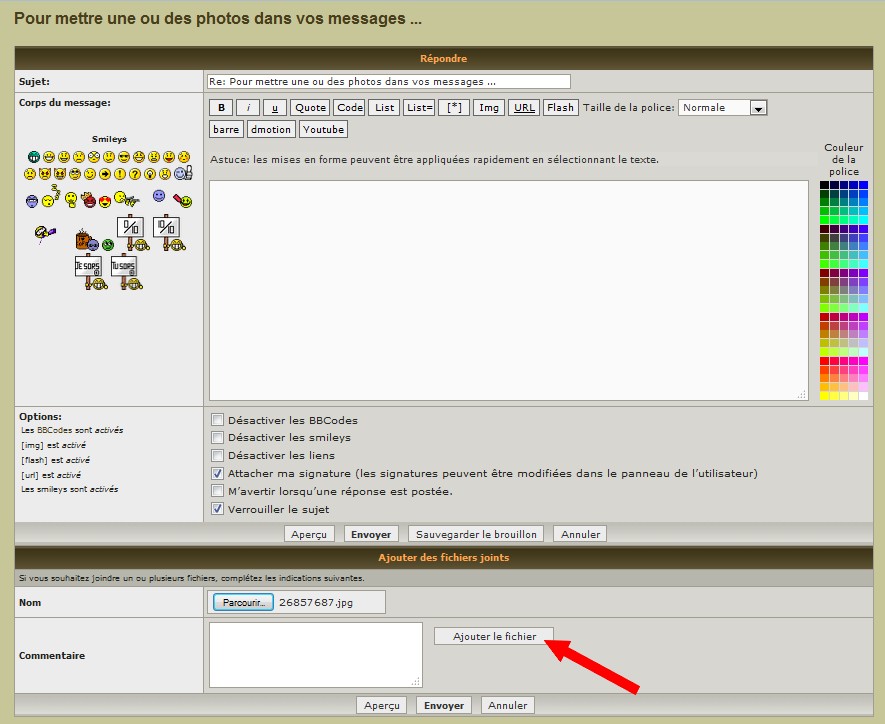 C'est très facile en utilisant la fonction intégrée au forum (en dessous de la saisie du message).