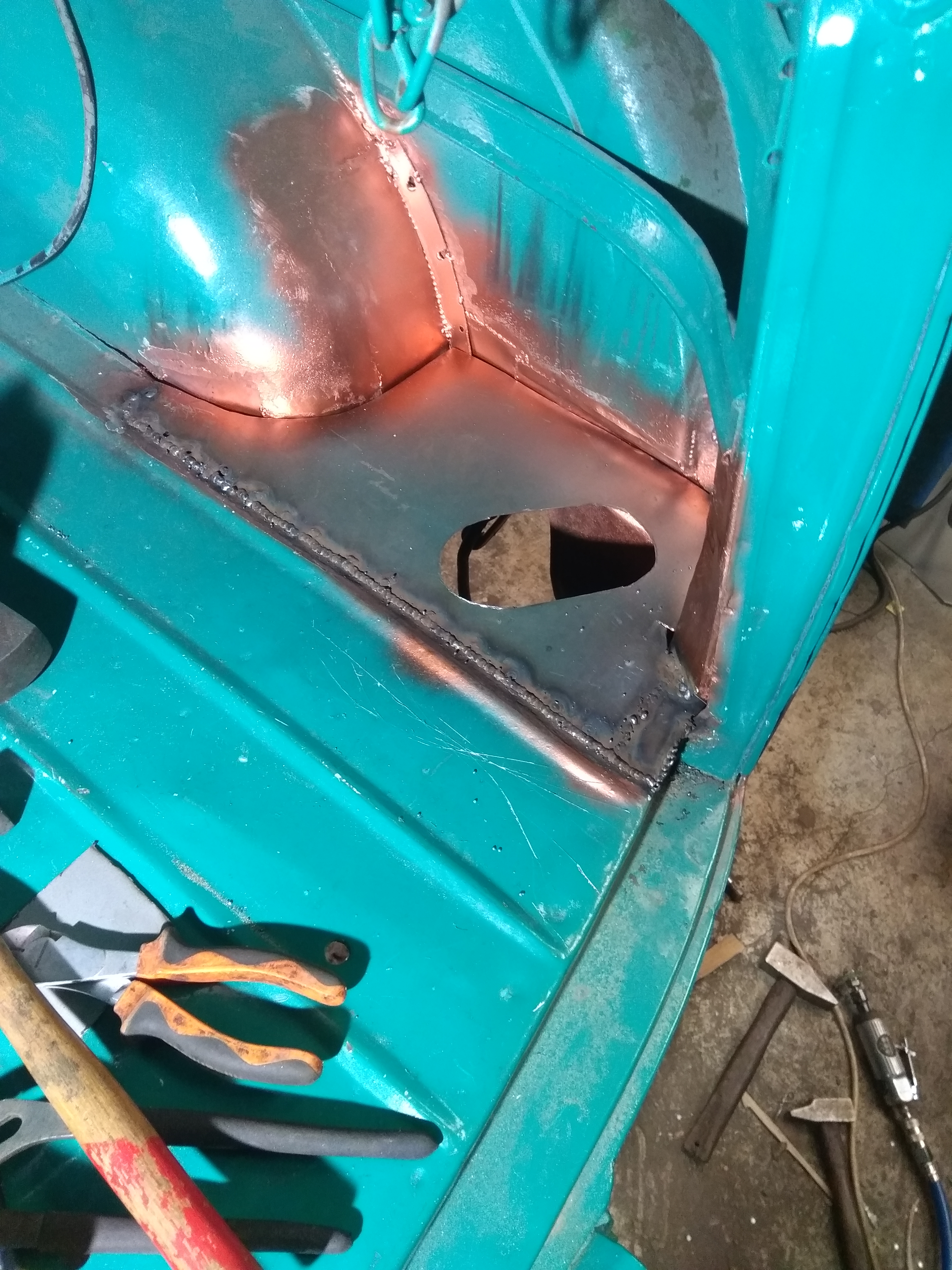 Reste plus qu'a meuler les soudures et instaler le passage de la goulotte d'essence pour pouvoir faire les trous de fixation et mettre des ecrous prisonniers .