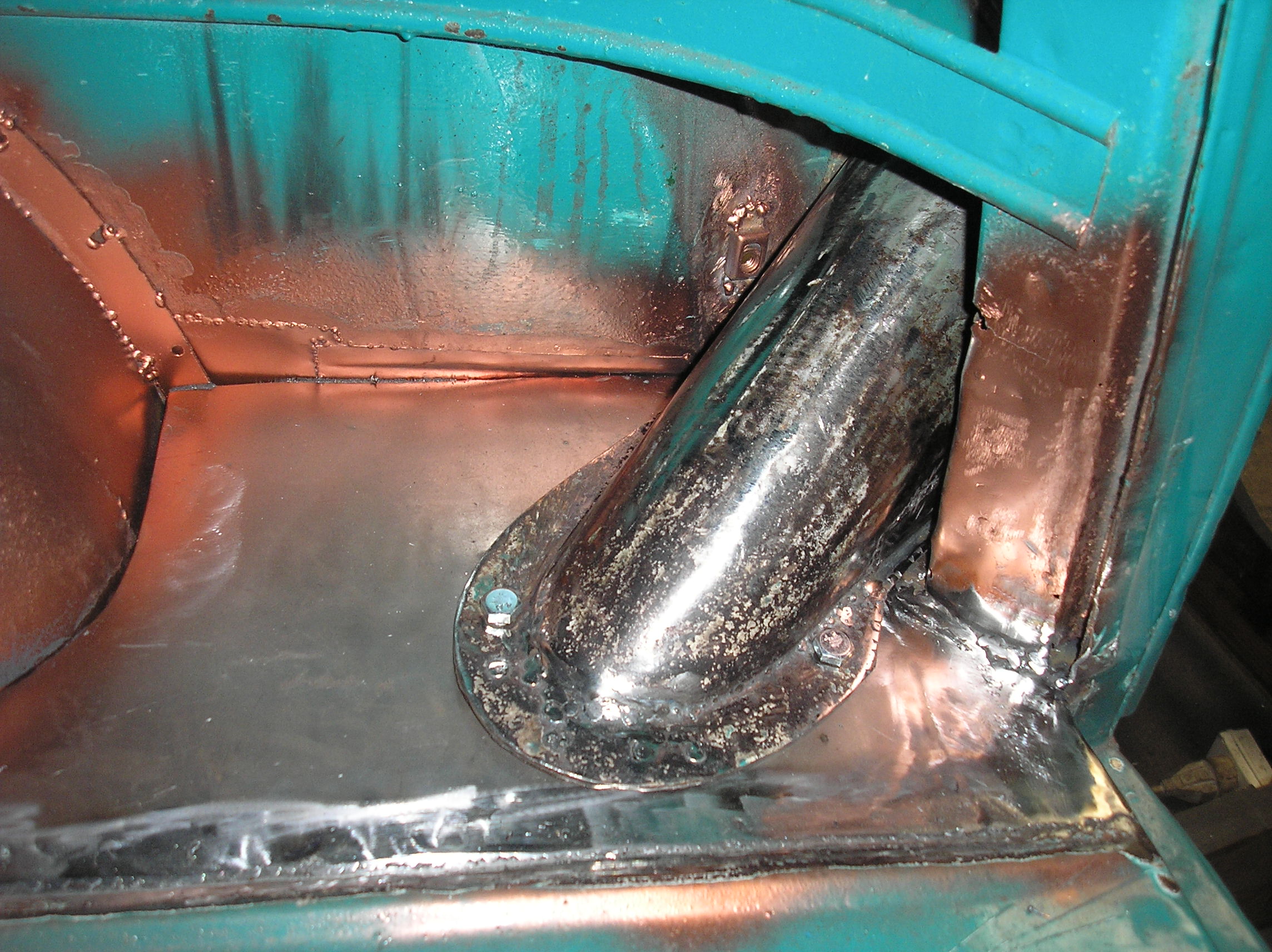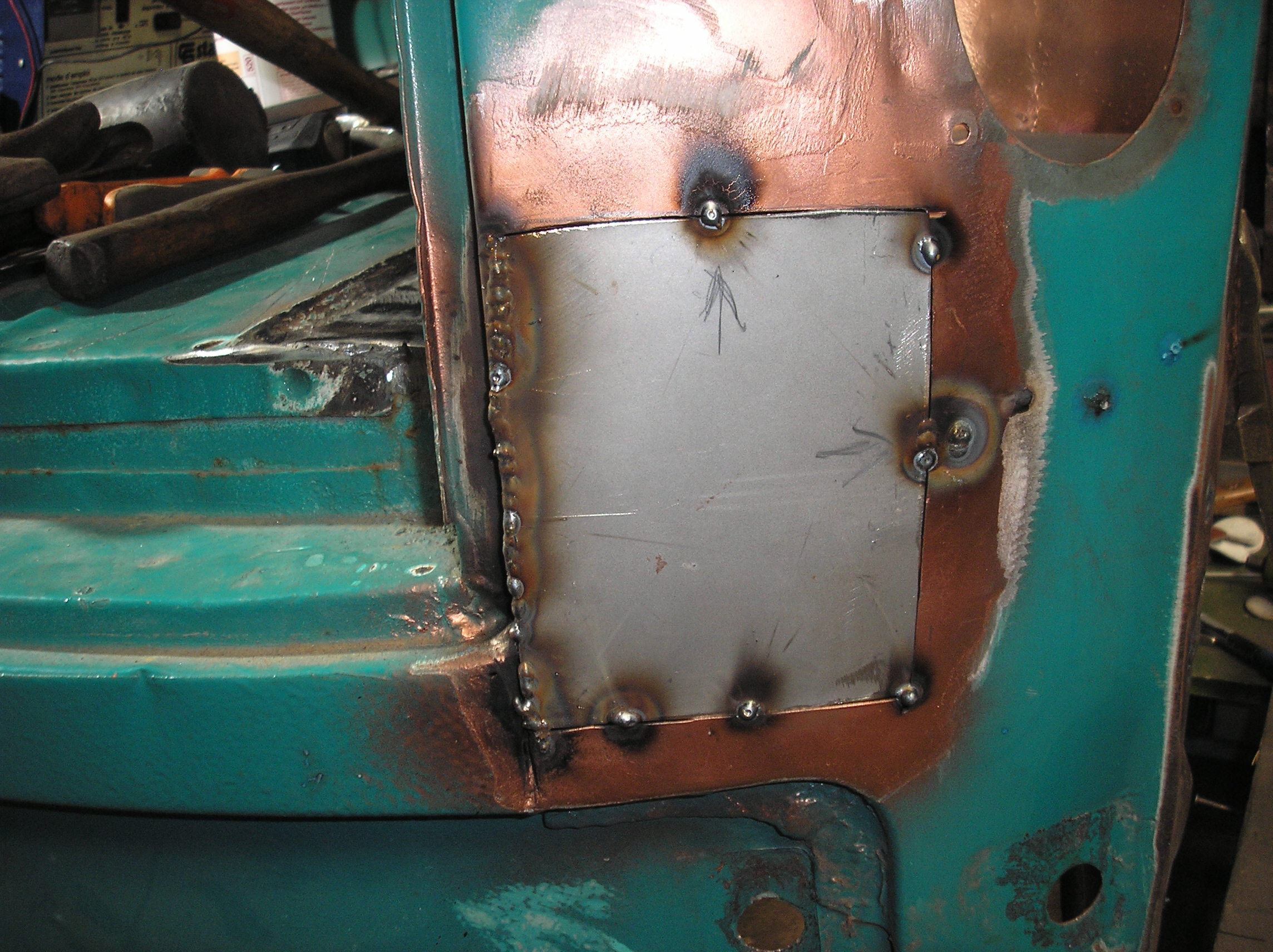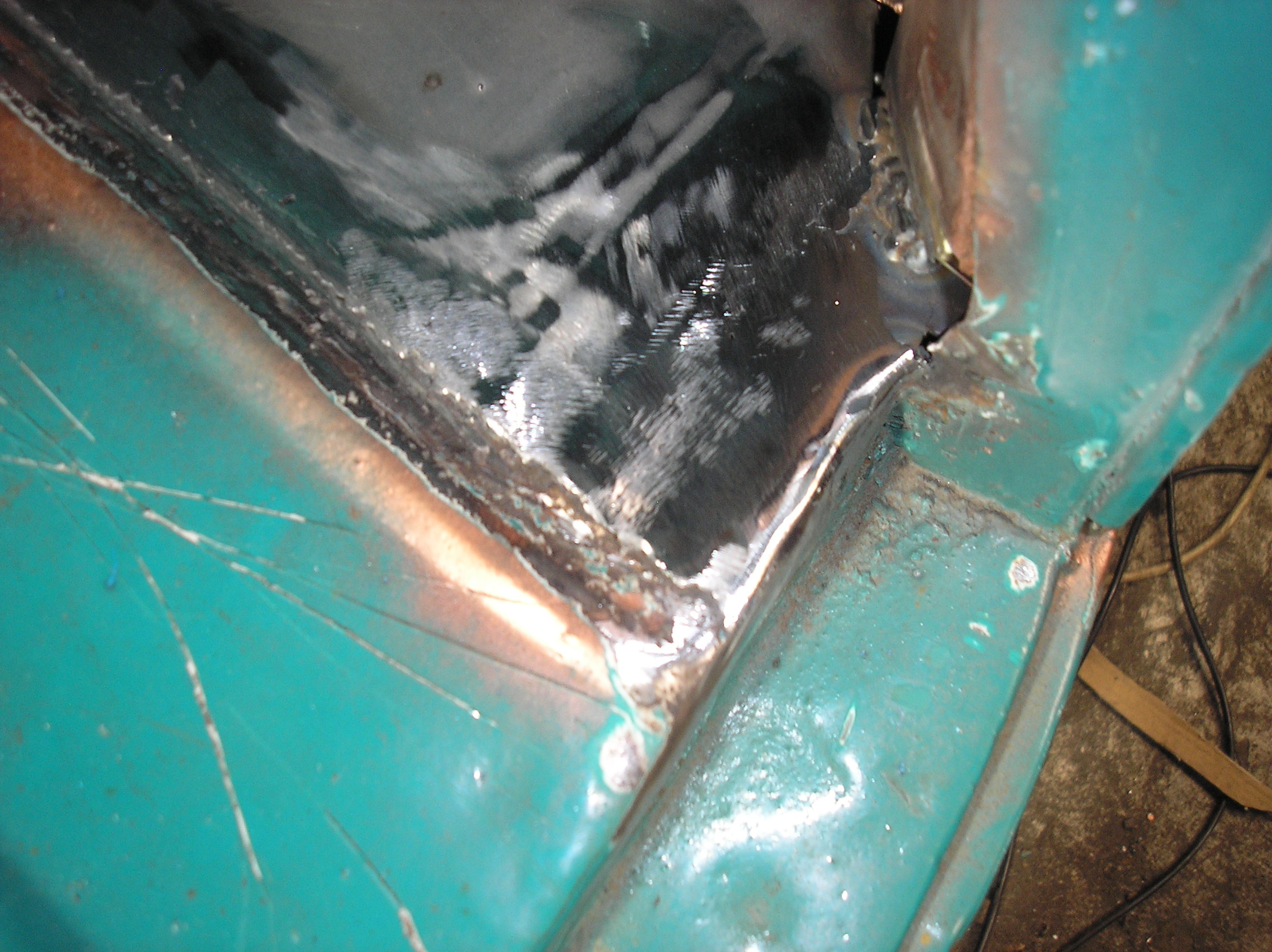 Bonjour à tous , aujourd'hui j'ai continué la bricole que javais commencé le 19 /07 du moins finir ce côté ARD ,donc pour commencer meuler la soudure de la tôle rapportée, ensuite reboucher l'angle arrondi du montant du coffre ,et comme j'avais encore un peu temps j'ai réparré le cache goulotte d'arrivé d'essence:[img][url][/url][/img]