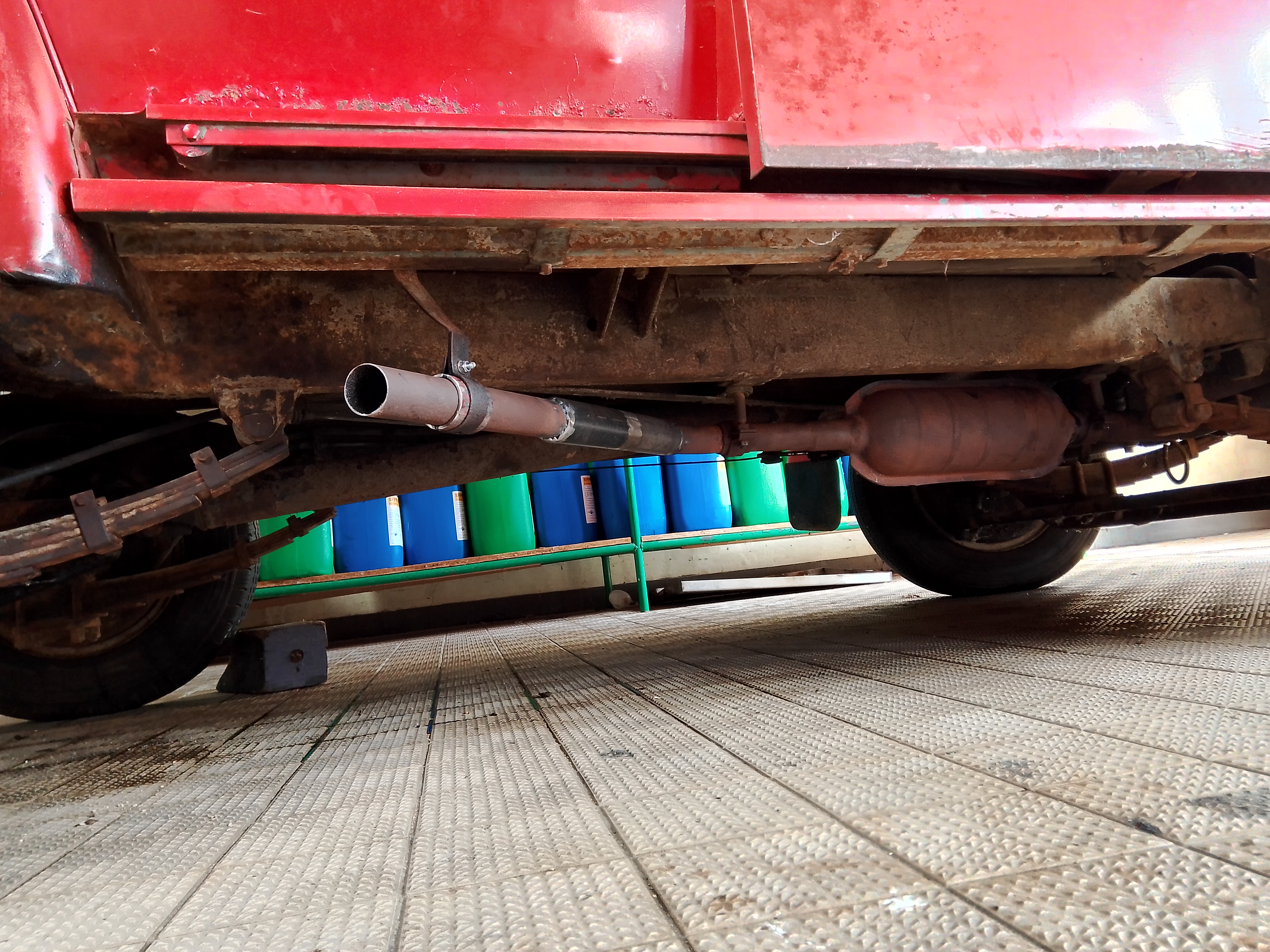 Changement de la pédale d'accélérateur ( tordue , ce qui rendait la conduite fort désagréable, ) ainsi qu'une partie de la timonerie d'accélération , au niveau de l'échappement, démontage total de la ligne ,il y avait une fuite au niveau de l'évasement coté moteur , une petite recharge de soudure a été faite , on verra le résultat au prochain démarrage. l'extrémité étant pourrie en attendant de le changer nous avons rabouté un tube après le silencieux désormais la sortie est présentable.