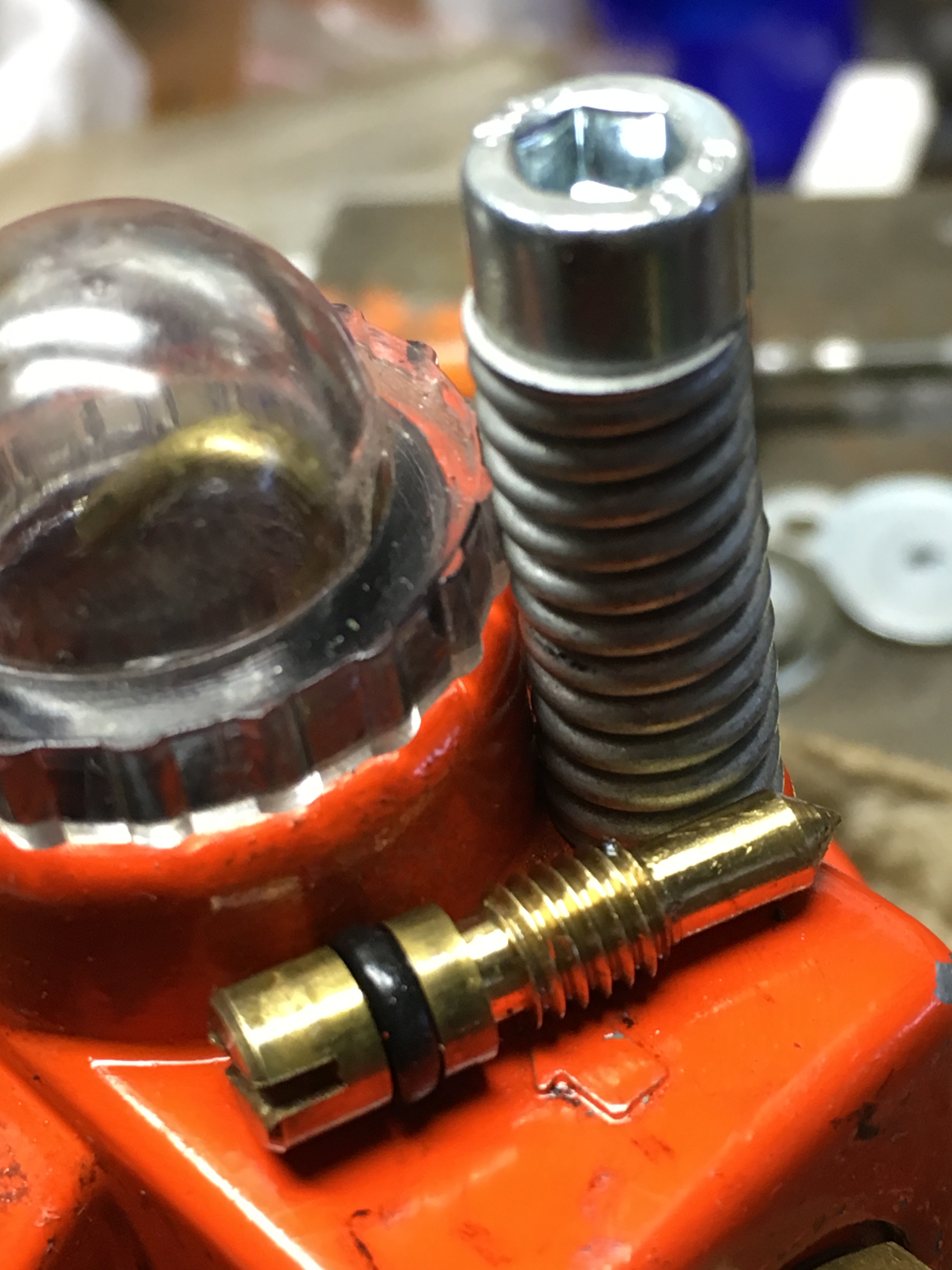 après essais, la vis micrométrique laisse passer un trop gros débit. Elle a donc été remplacée par un vis M6 taillée en pointe très effilée et un ressort pour éviter un déreglage.