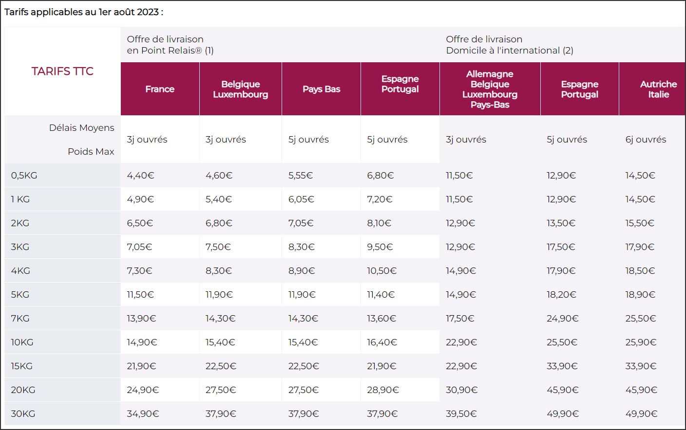 leur intérêt pour la ou les pièces souhaitées.Afin que puissiez avoir une 1ère idée des coûts de transport, ci-dessous le tarif Mondial Relay