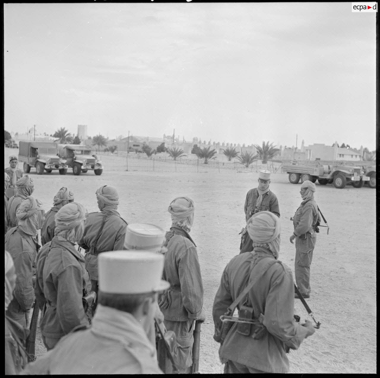 Grand Erg oriental. Revue du détachement de la CSPO participant à l'expédition. La CSPO est la Compagnie Saharienne Portée des Oasis.