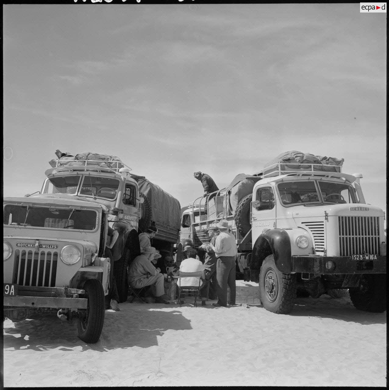 Grand Erg oriental. Arrêt casse-croûte. Véhicules Hotchkiss Willys et "Gazelle" Berliet.