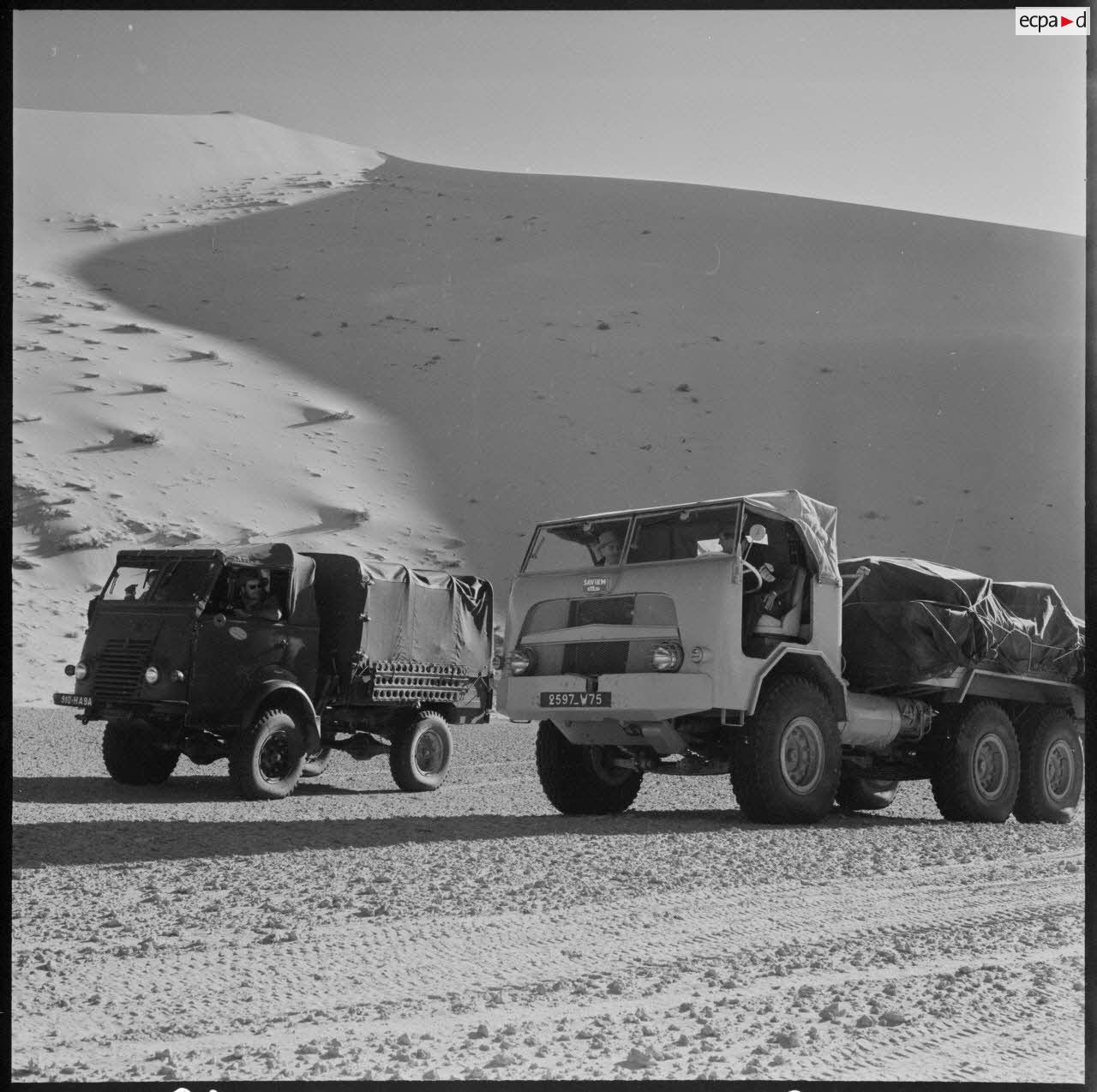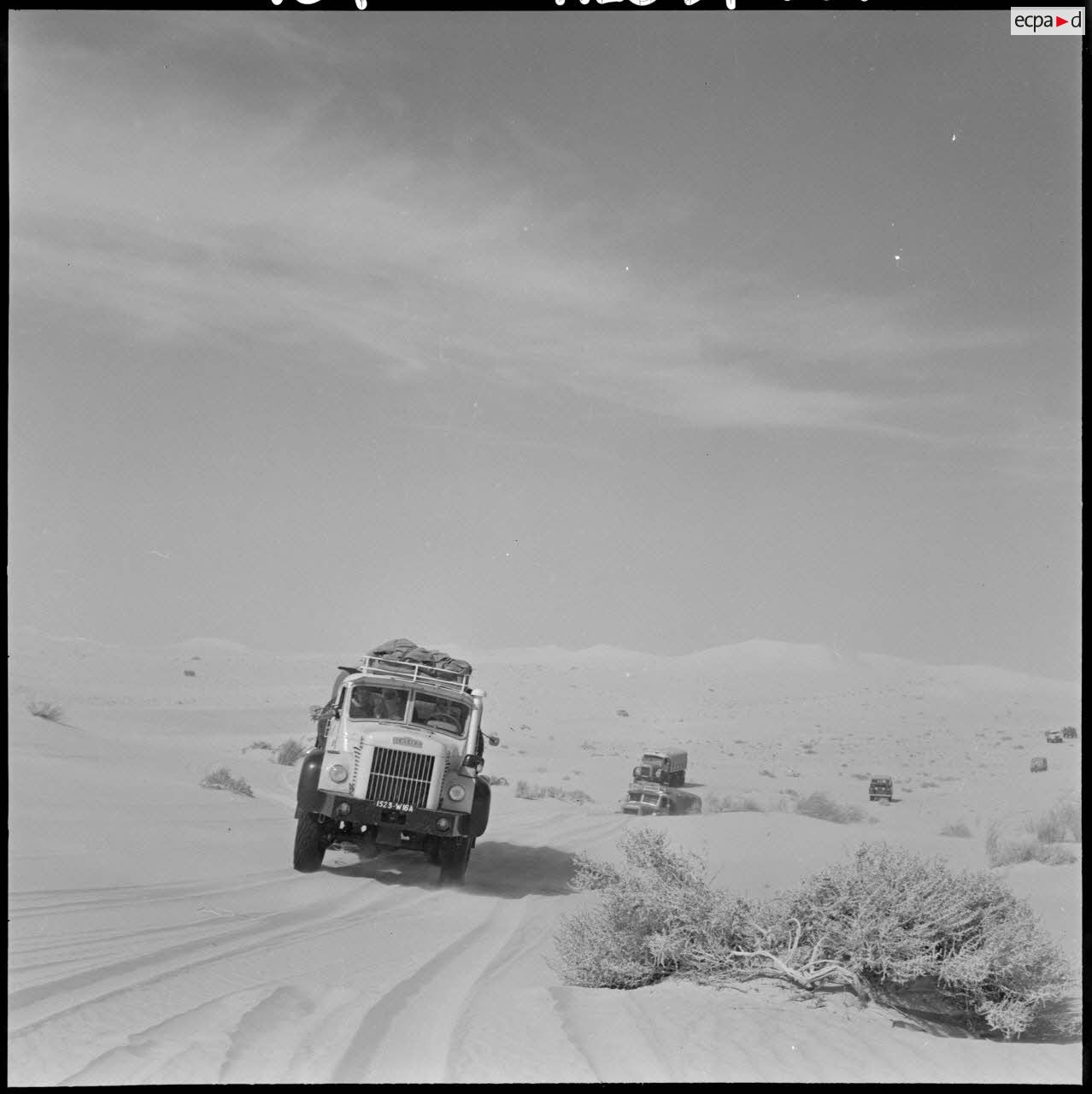 Grand Erg oriental. Le convoi roule dans la région des Grandes Dunes. En tête de la colonne, les "Gazelles" Berliet.