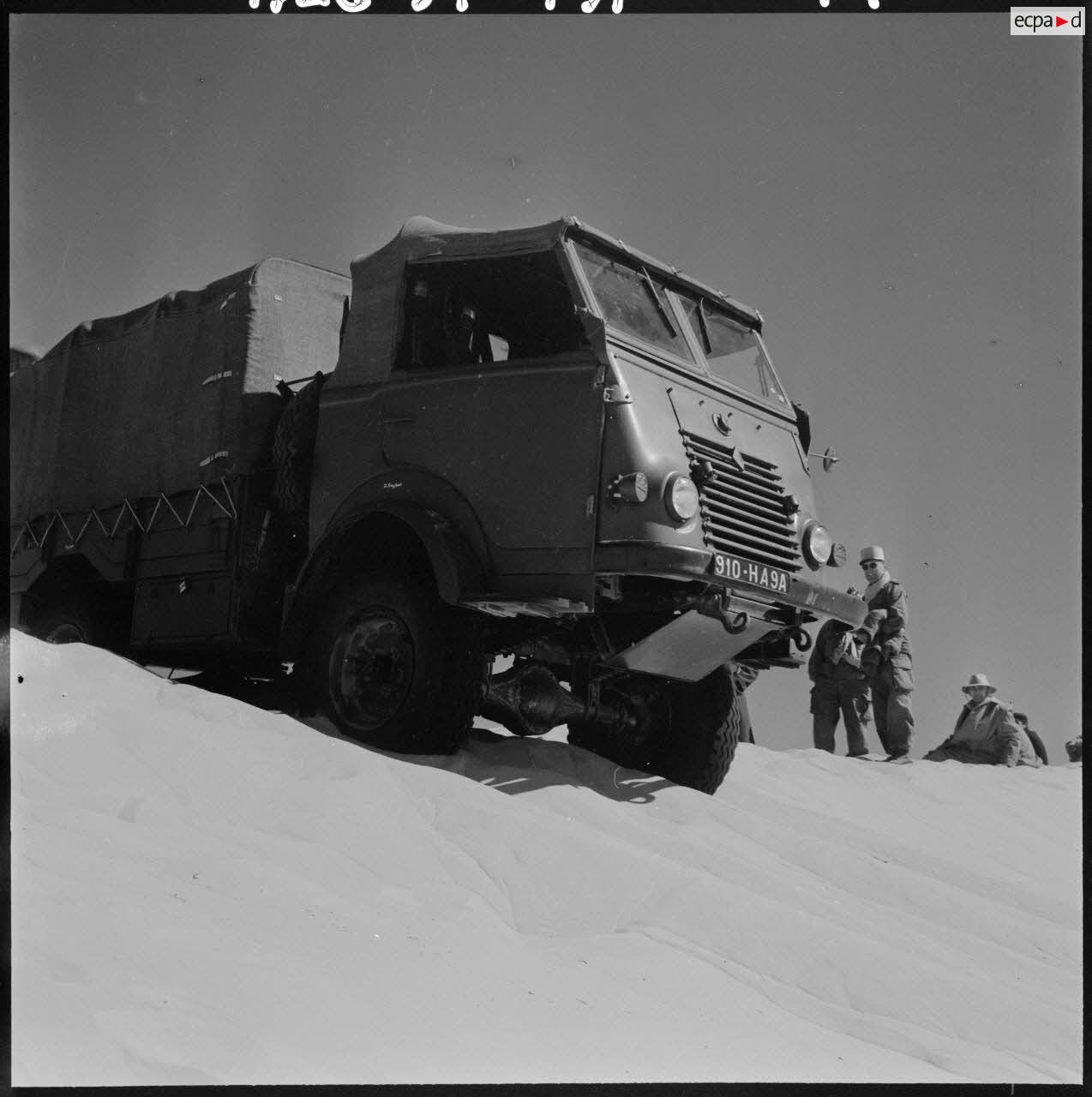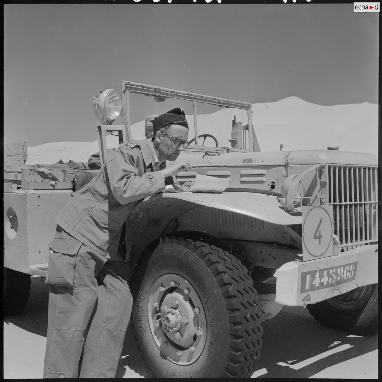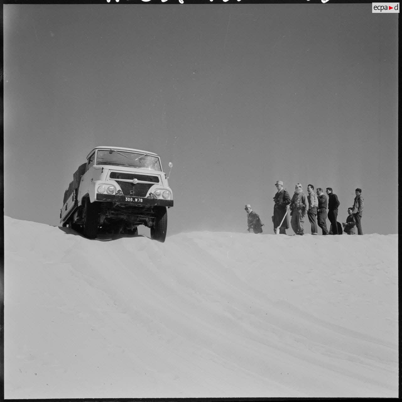 Grand Erg oriental. Equipe des travaux publics et ponts et chaussées de l'OCRS (organisation commune des régions sahariennes). Camion Power Wagon Dodge.