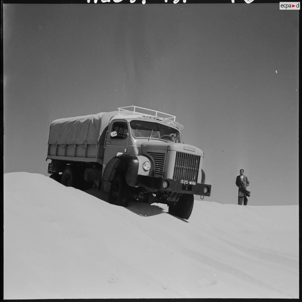 Grand Erg oriental. Le camion Berliet "Gazelle" passe une dune.