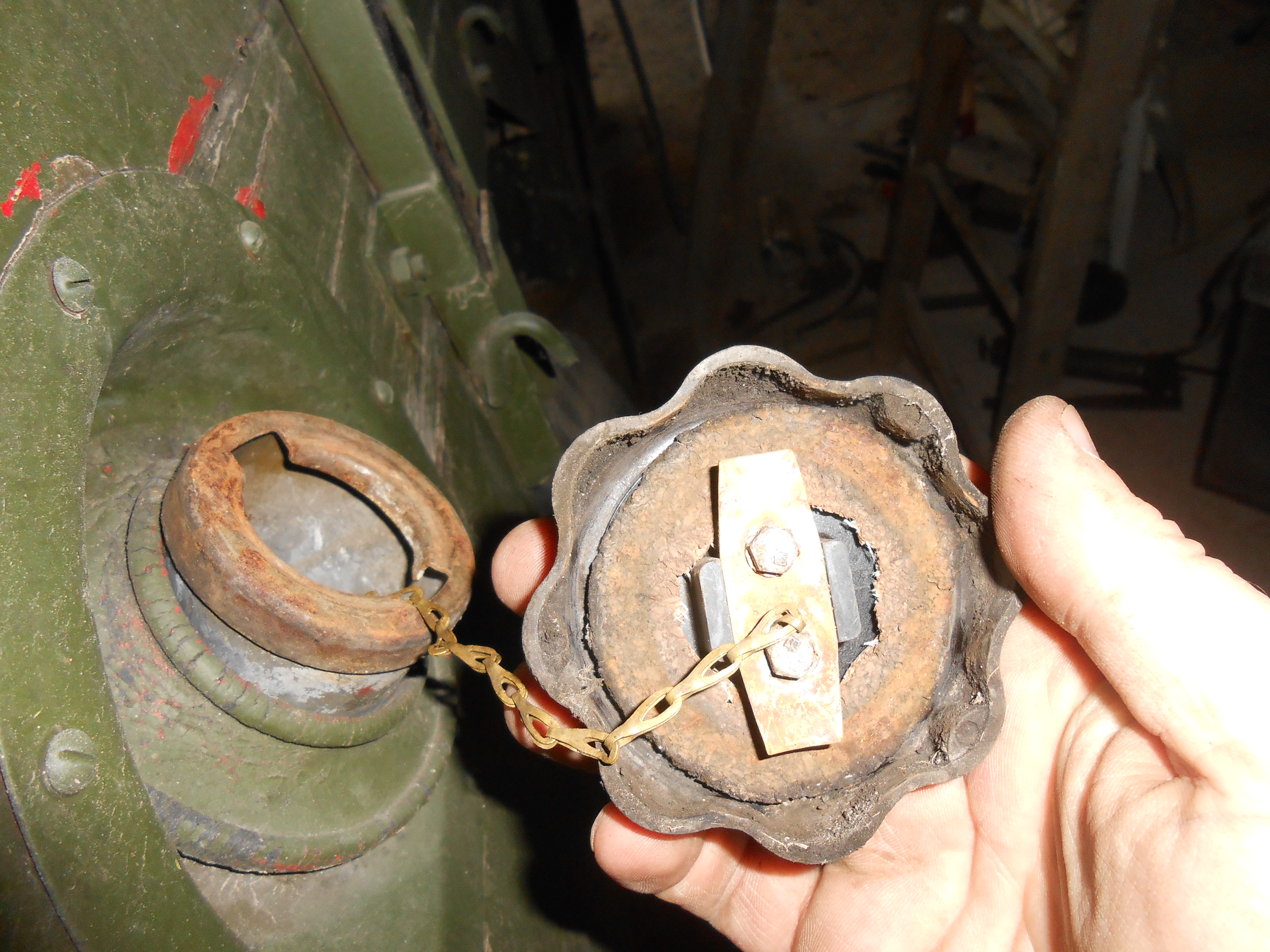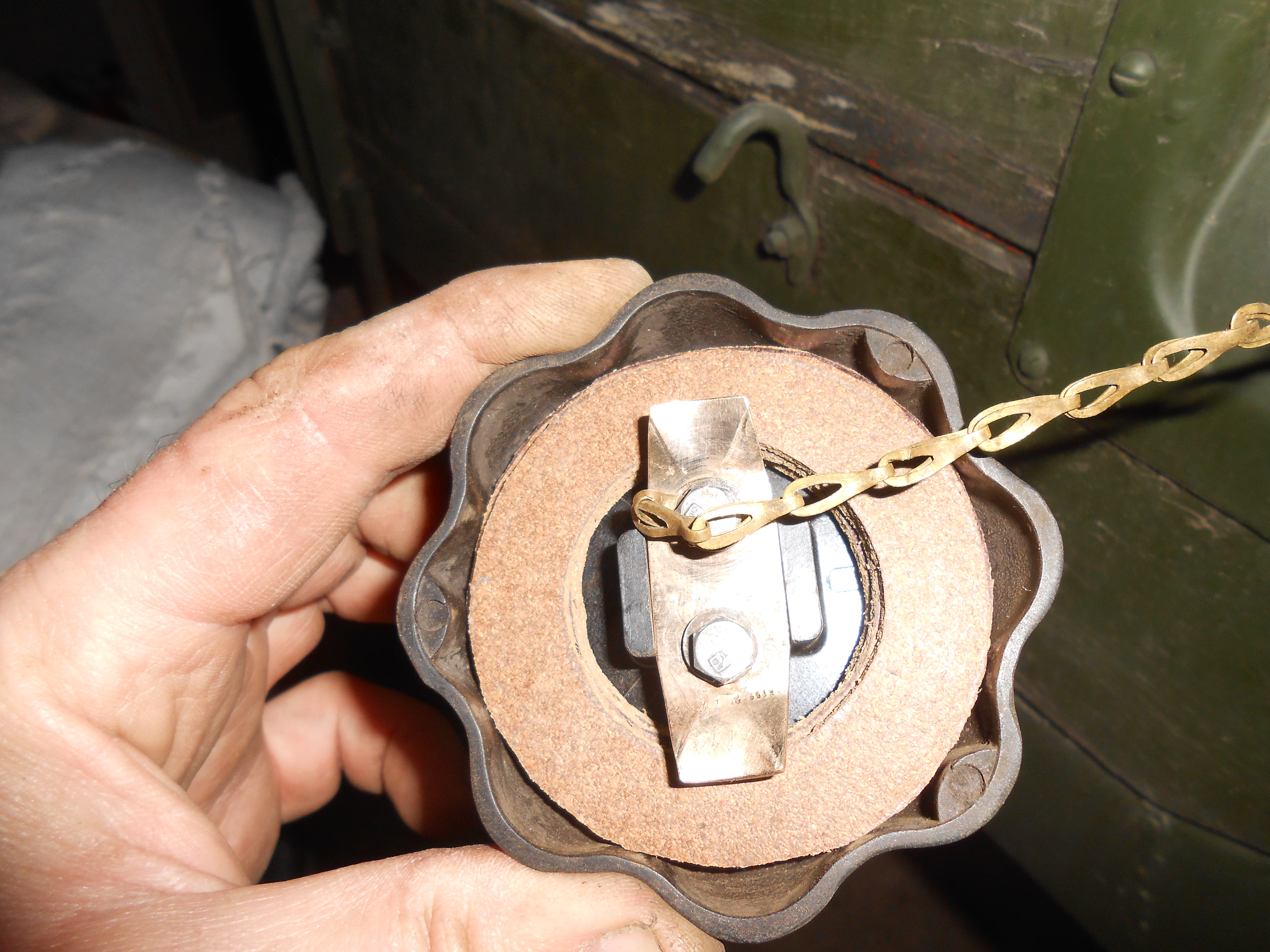 Le bouchon se trouve sur le côté arrière droit. Il est du type à baïonnette en bakélite et subit les affres du temps, notamment du soleil et de la lune.