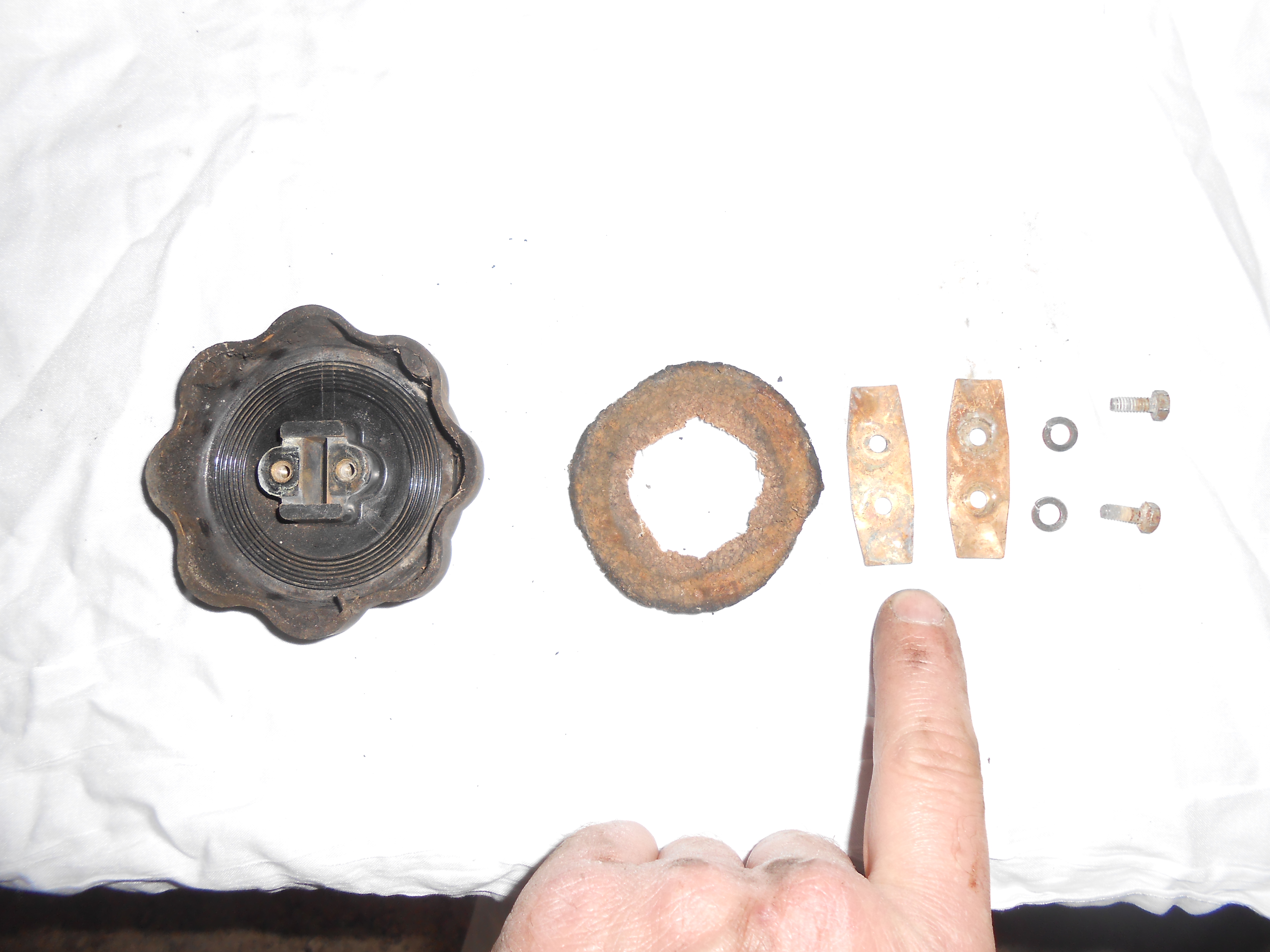 A l'aide d'une pince à bec plat ou courbé on procédera après nettoyage à redonner une courbure aux lamelles AVANT remontage. En effet, le bouchon étant en bakélite, si vous forcez sur les lamelles une fois montées, vous avez 100% de chance de le casser. On changera le joint en le remplaçant par un joint nébar au côte EXT 64,5 INT 37,5 d'épaisseur 3 à 4mm. L'objectif étant qu'il ferme avec une légère pression.