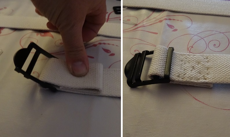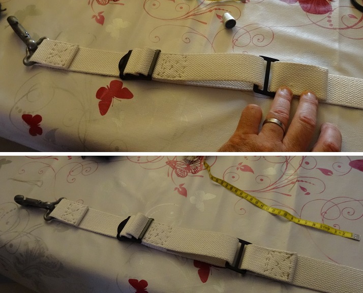 .. repasser par la boucle de réglage et coudre le sous ensemble boucle/crochet.