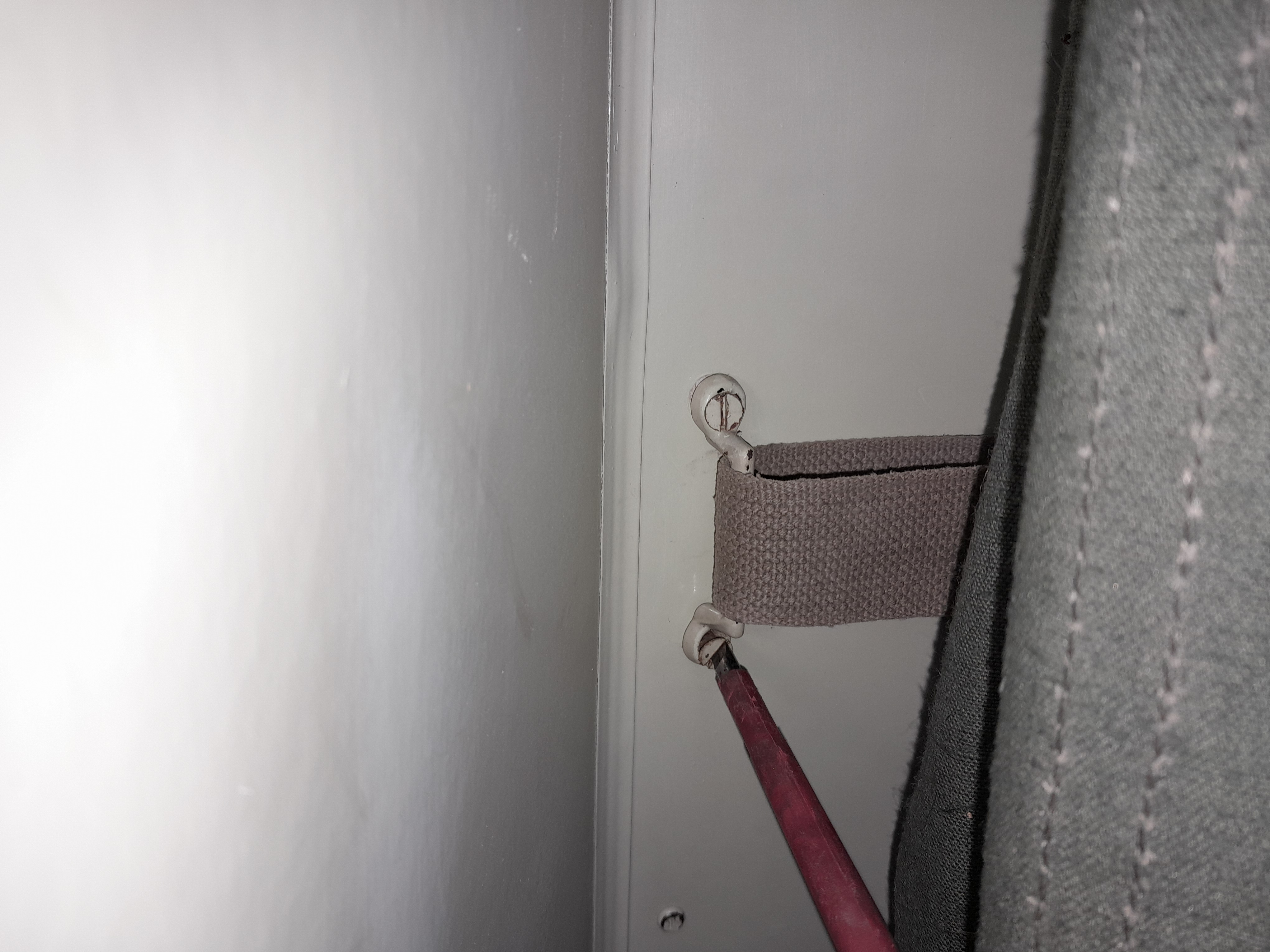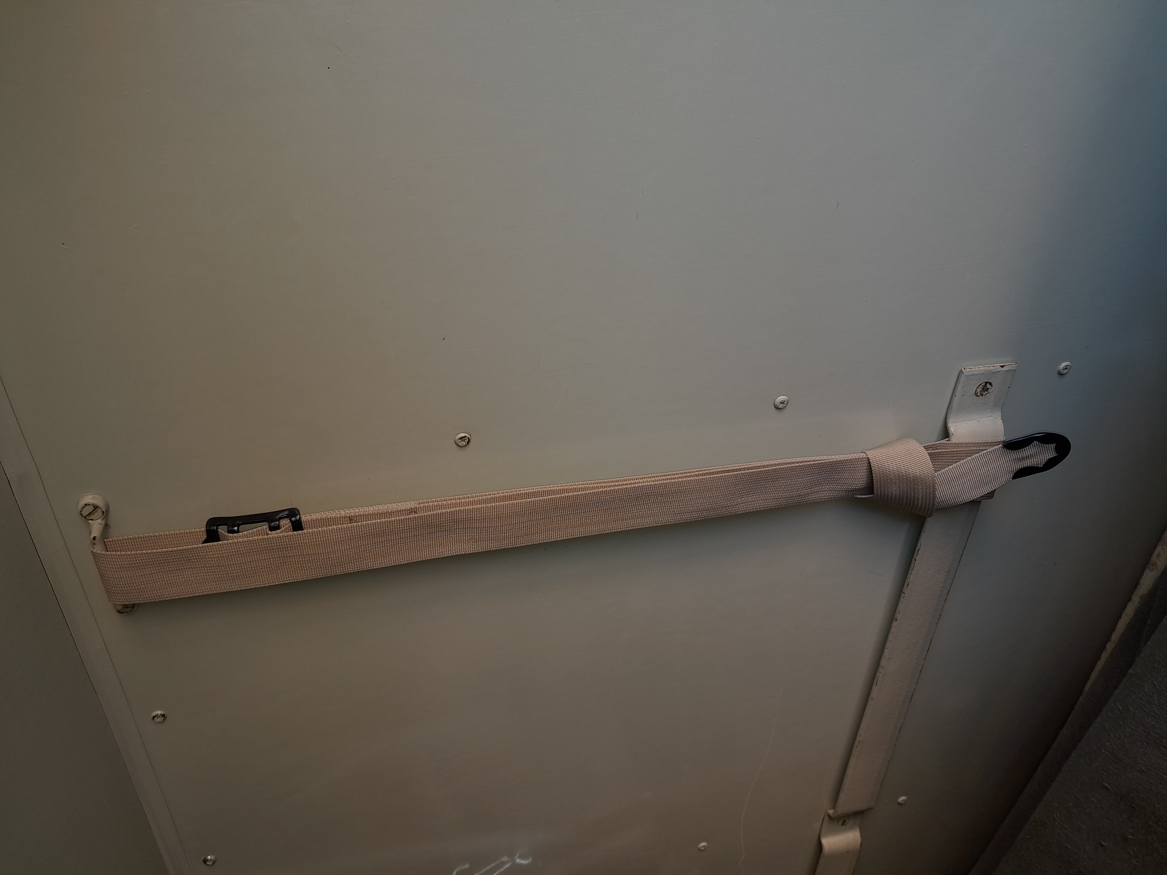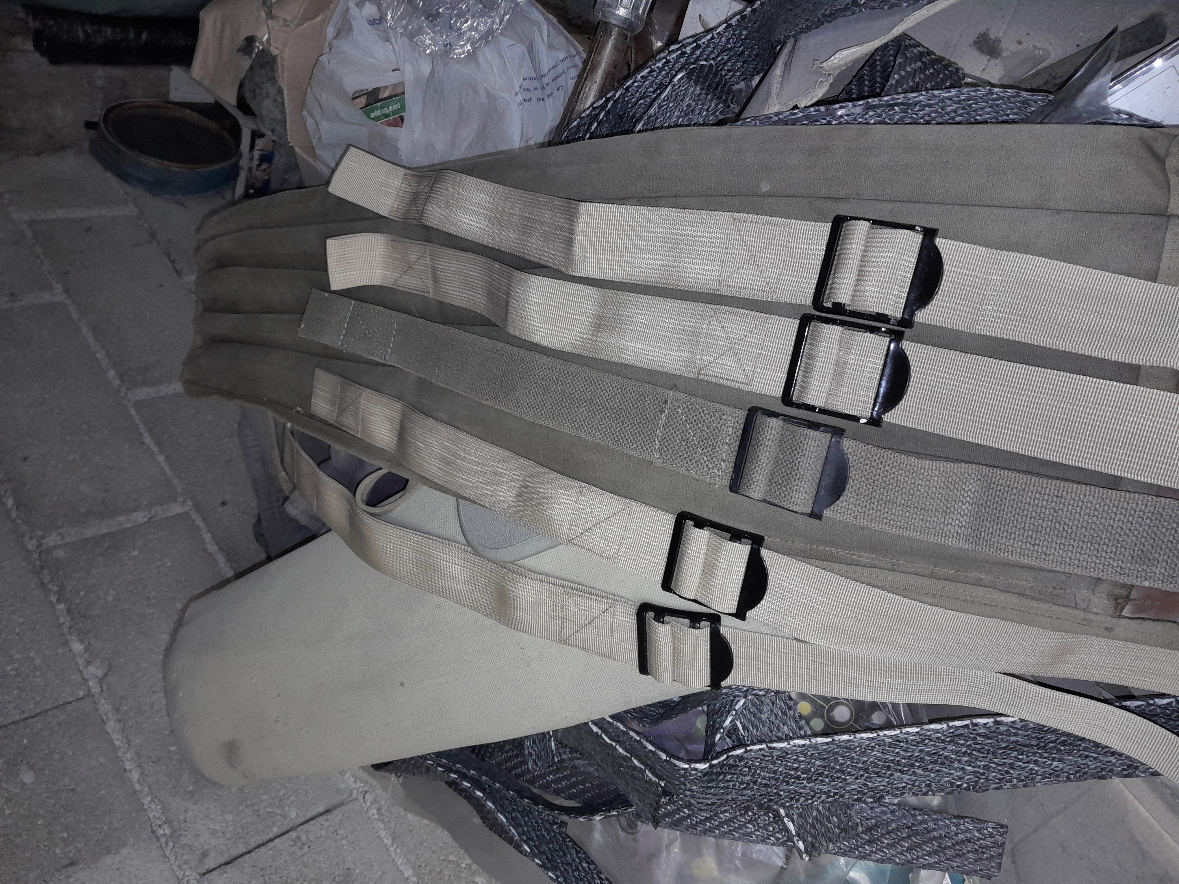 Lors de la partie 1 nous avons refait les sangles des brancards, à l'aide de sangles en nylon tressées de même largeur (4CM). Passons maintenant aux sangles latérales, au nombre de quatre, fixées sur des supports métalliques de chaque côté des panneaux droits et gauches des sanitaires.